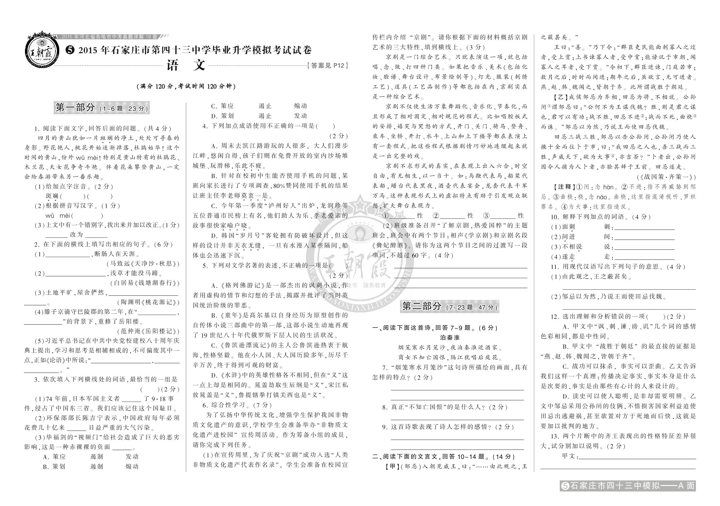 石家庄市第四十三中学毕业升学模拟考试试卷【5】