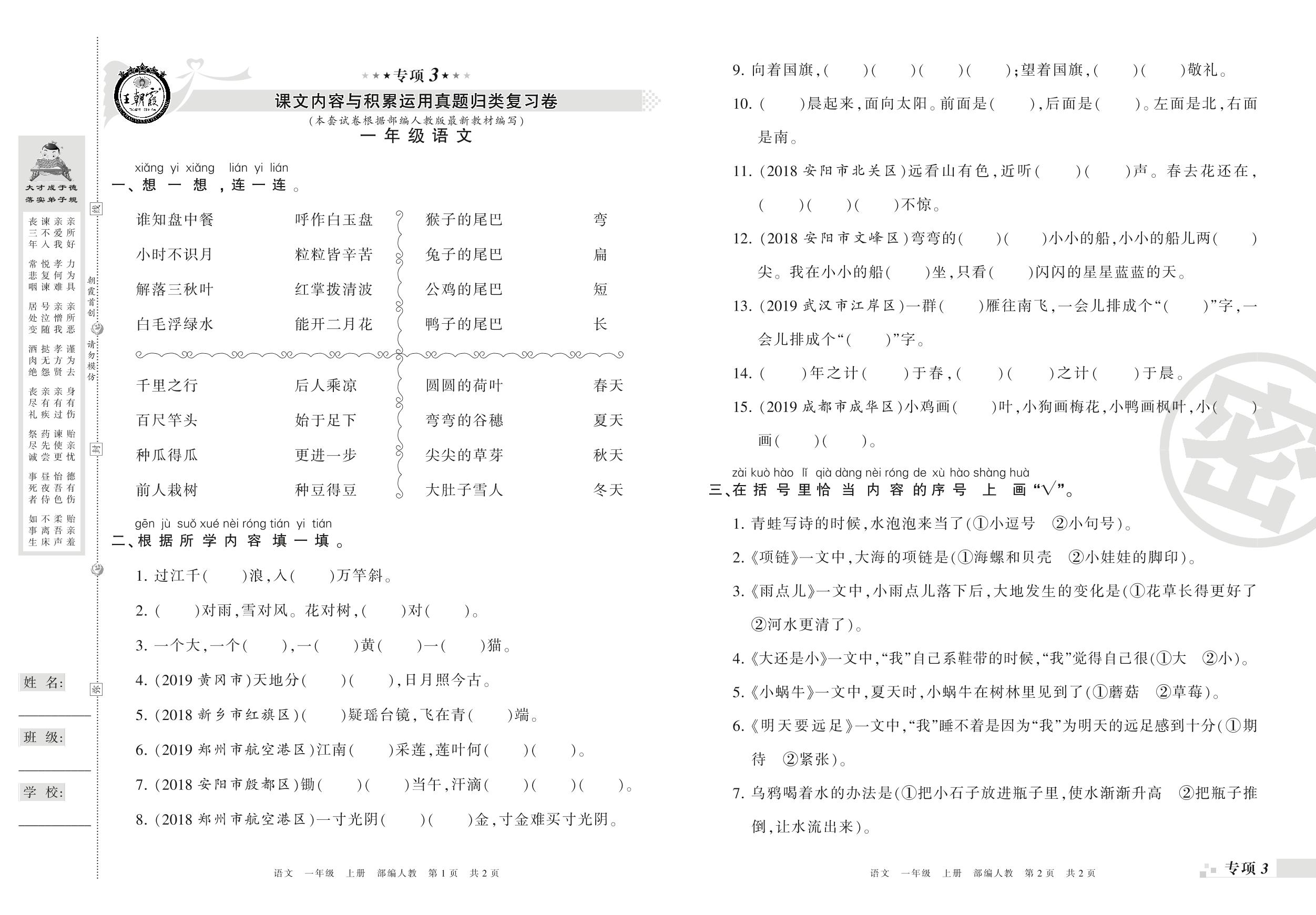 王朝霞期末专项卷——课文内容与积累运用、口语交际与写话真题归类复习卷一年级上册语文(人教版)_R210731181132【0】