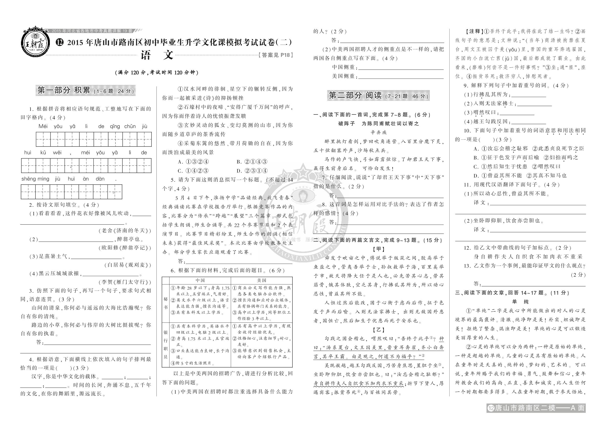 唐山市路南区初中毕业生升学文化课模拟考试试卷(二)【12】