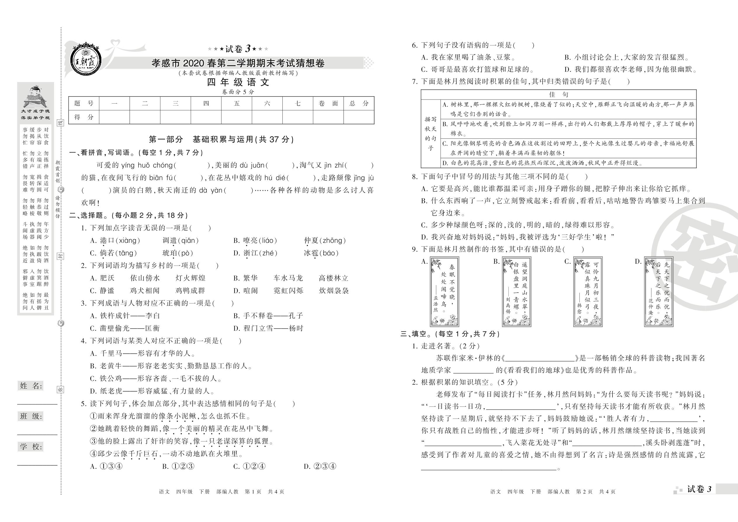 2018-2019学年第二学期孝感市四年级语文试卷(人教版)【3】