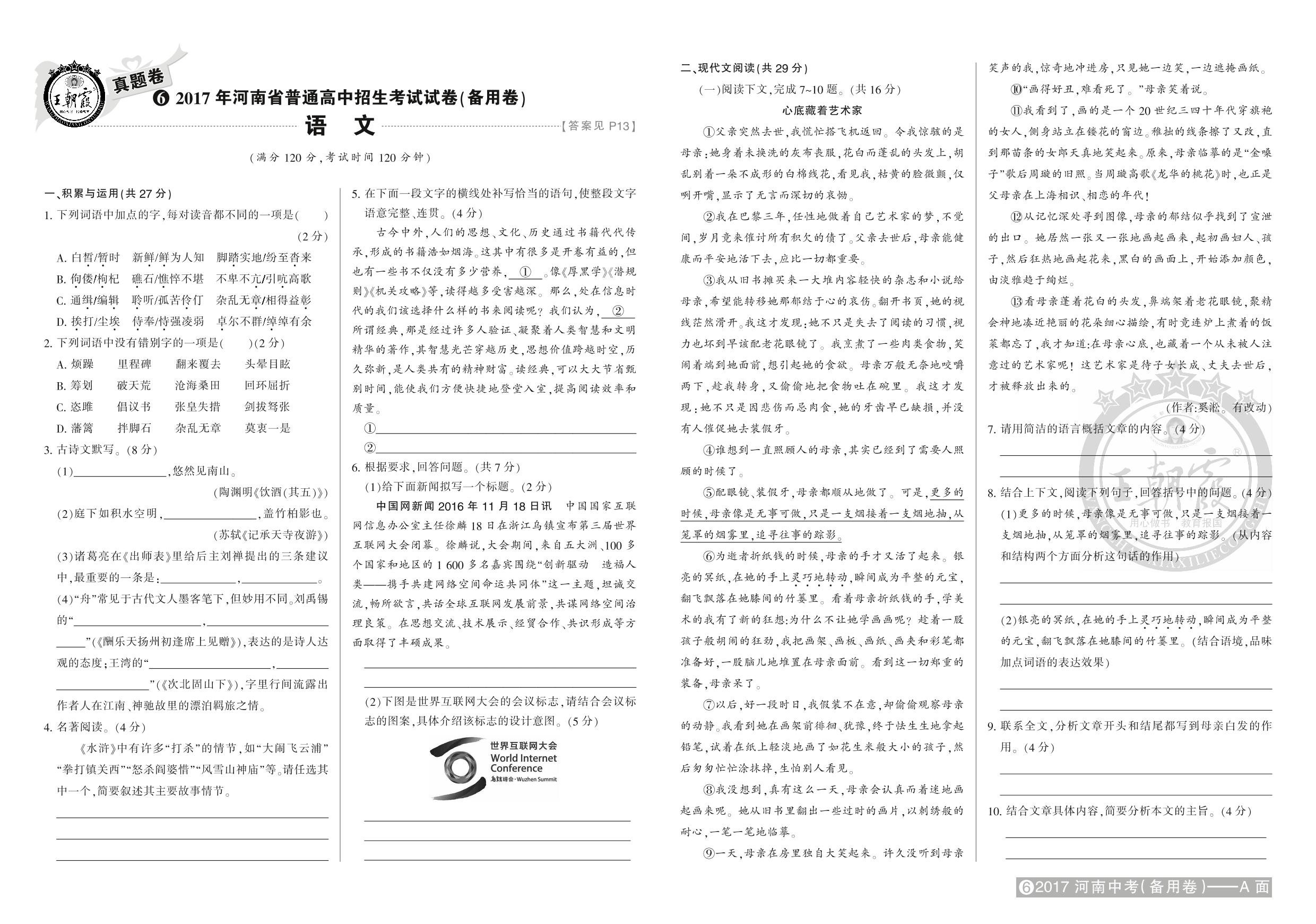 2017年河南省普通高中招生考试试卷(备用卷)【6】
