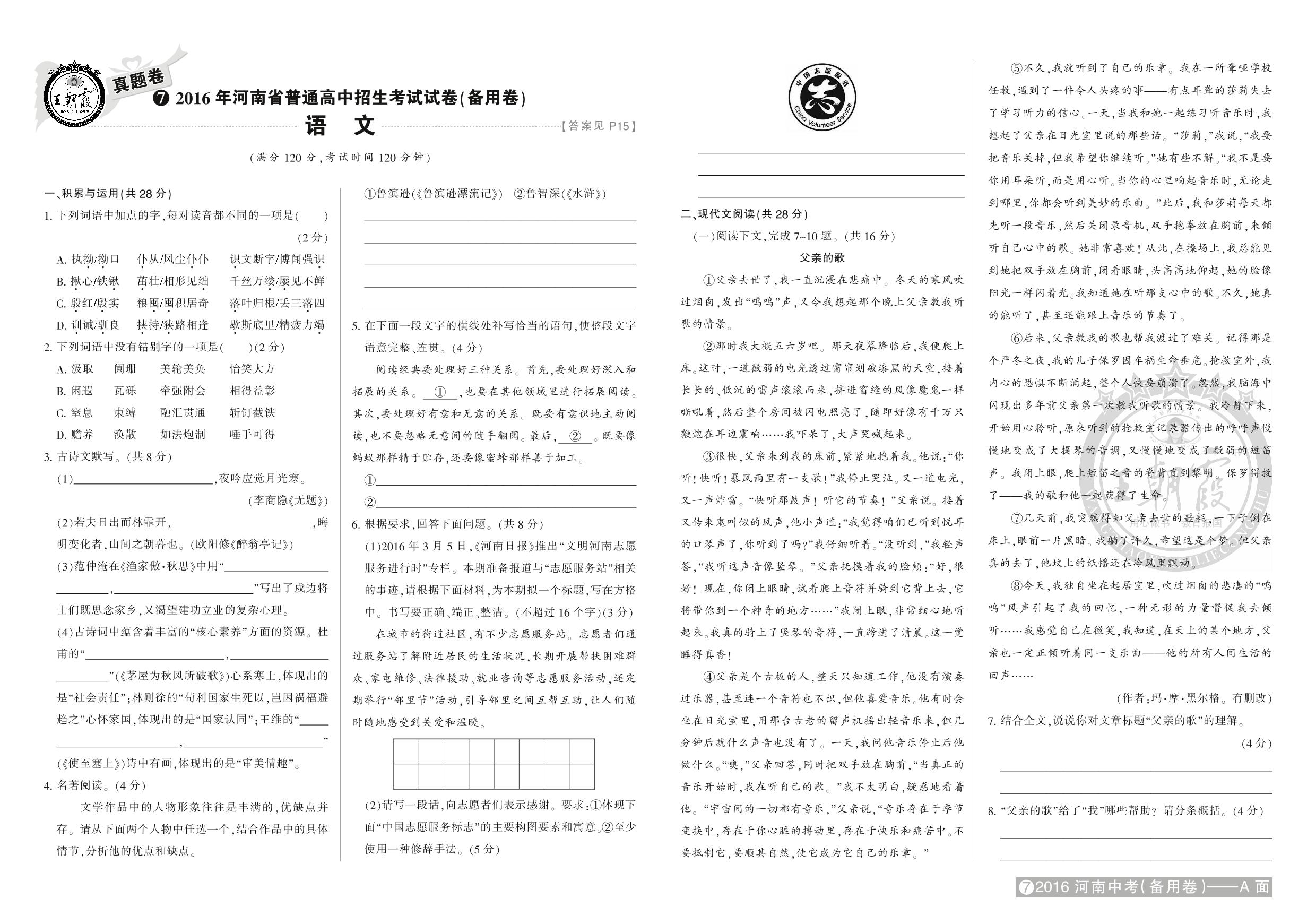 2016年河南省普通高中招生考试试卷(备用卷)【7】