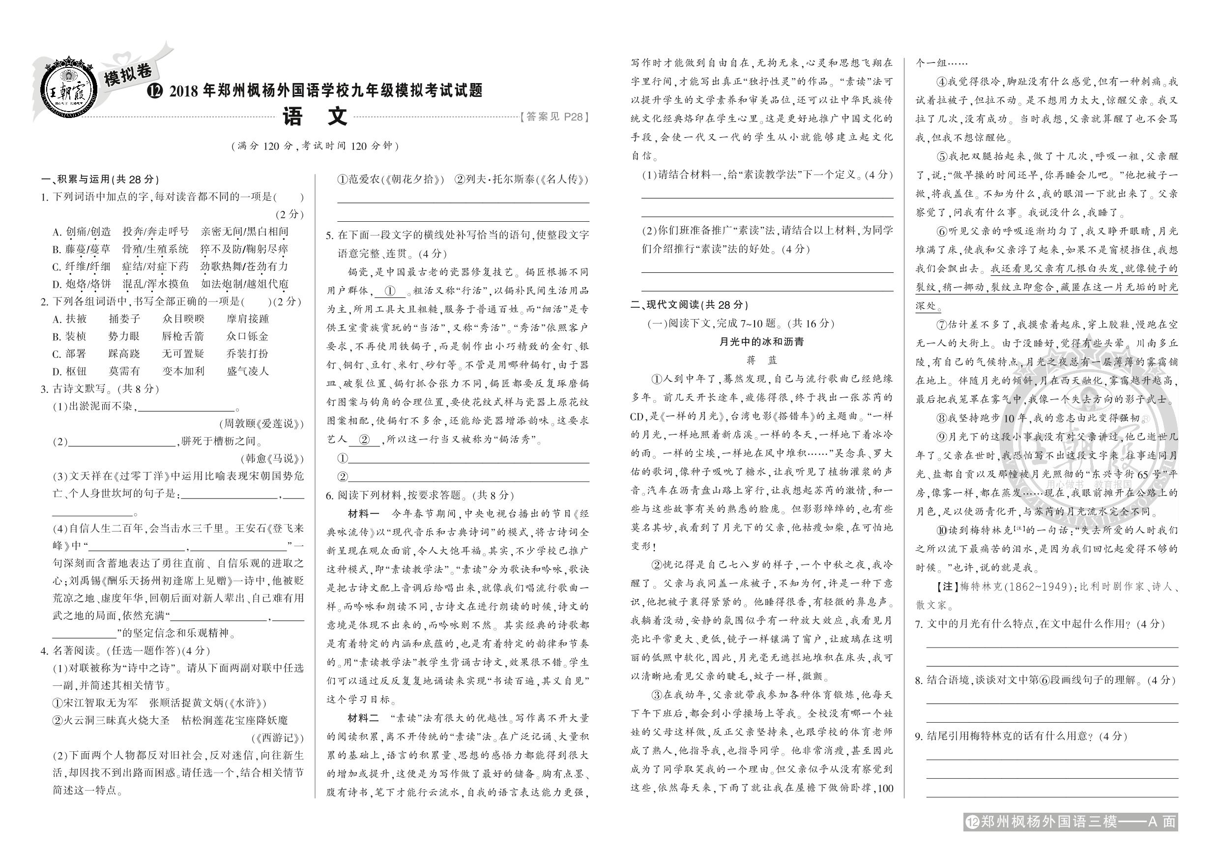 2018年郑州枫杨外国语学校九年级模拟考试试题【12】