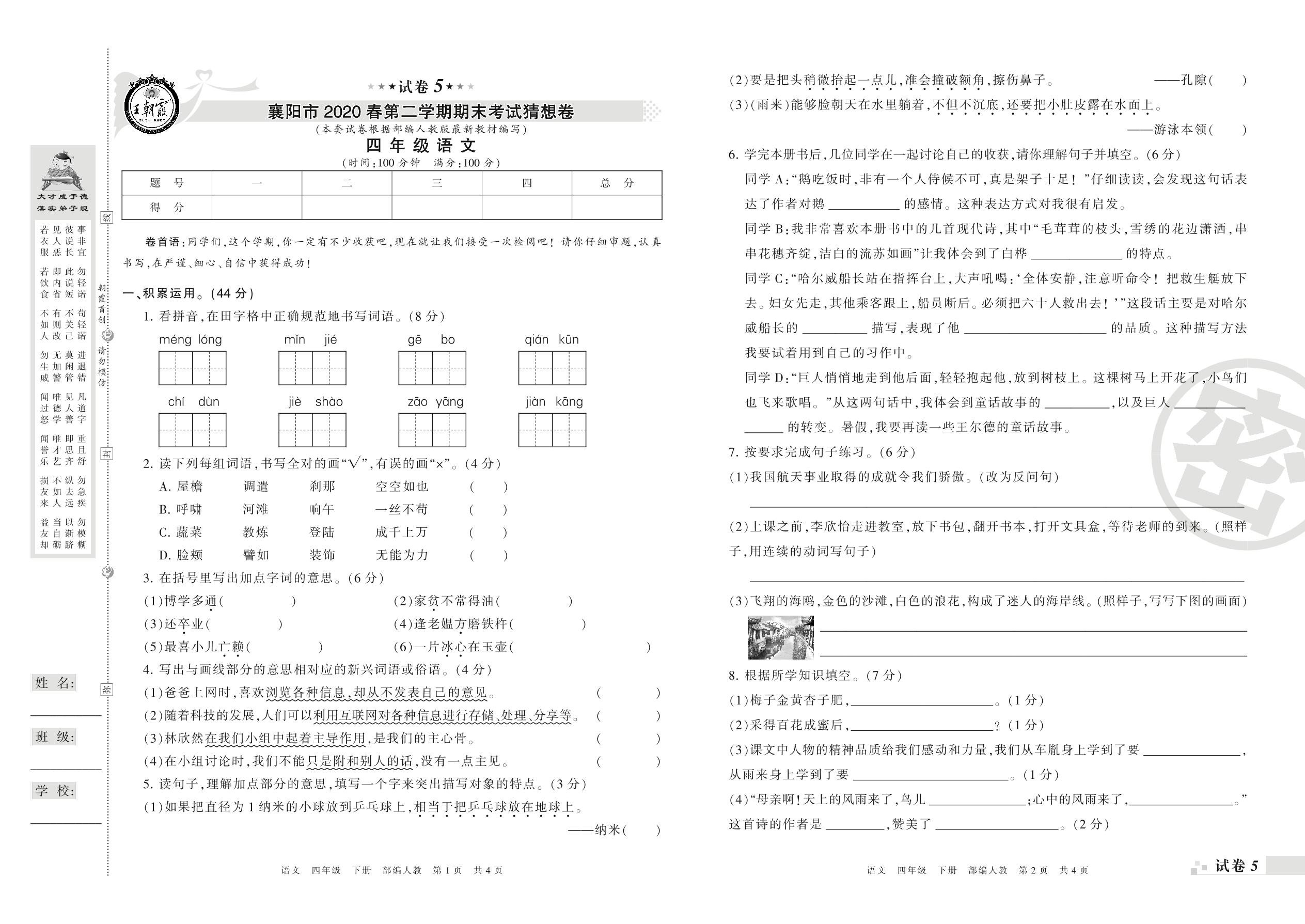 2018-2019学年第二学期襄阳市猜想卷四年级语文试卷(人教版)【5】