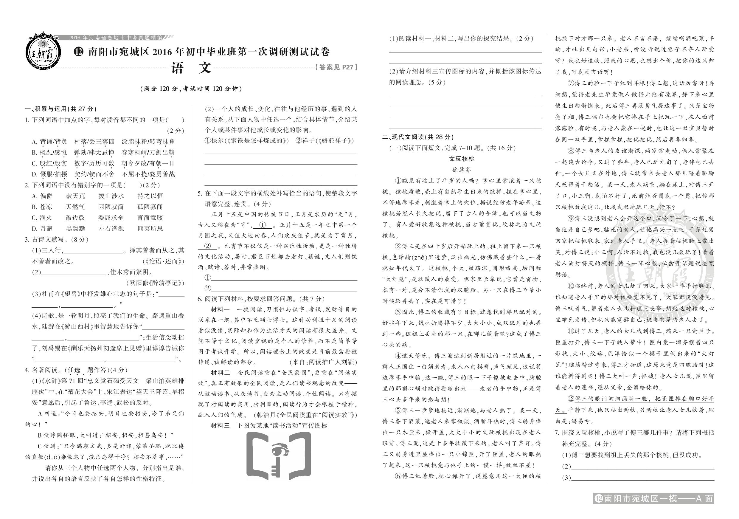 南阳市宛城区2016年初中毕业班第一次调研测试试题【12】