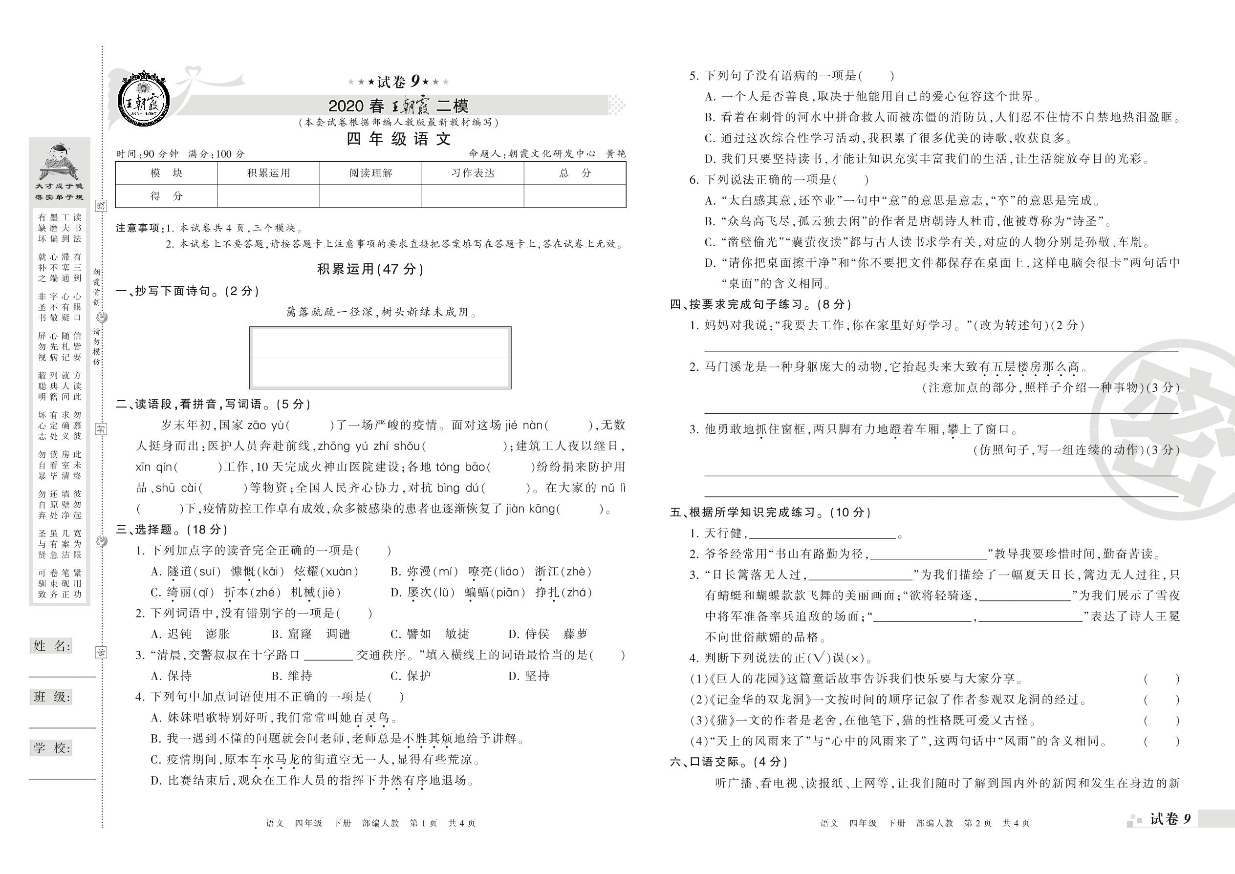王朝霞期末模拟卷四年级下册语文(人教版)_R210801192835【9】