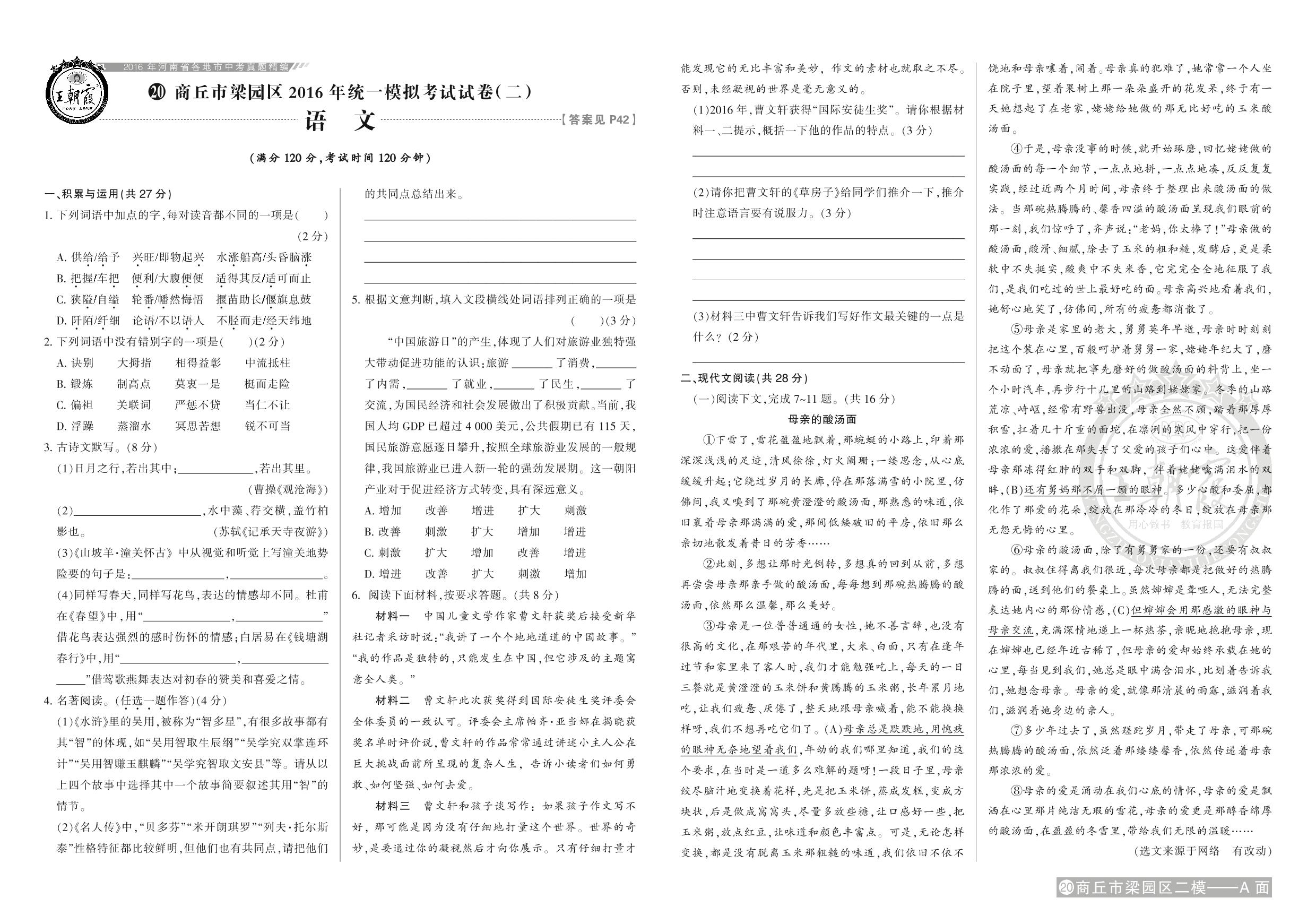 商丘市梁园区2016年统一模拟考试试卷(二)【20】