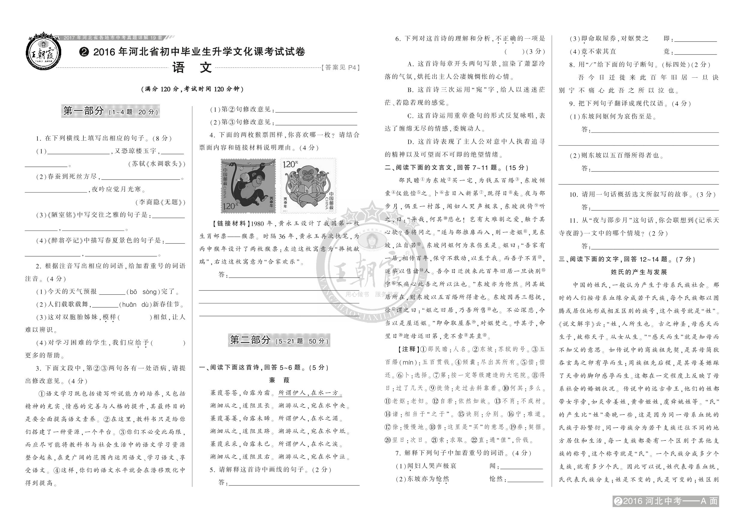 2016年河北省初中毕业升学文化课考试试卷【2】