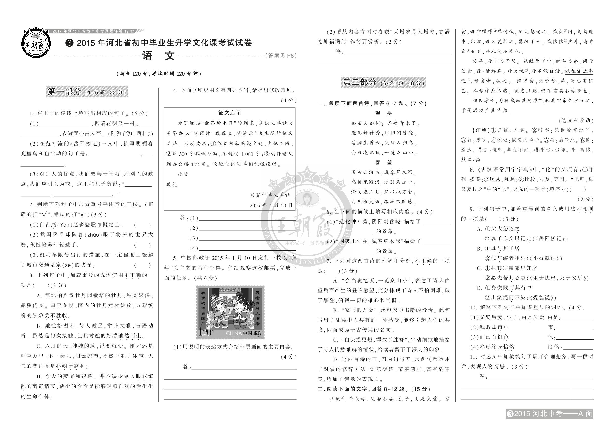 2015年河北省初中毕业升学文化课考试试卷【3】