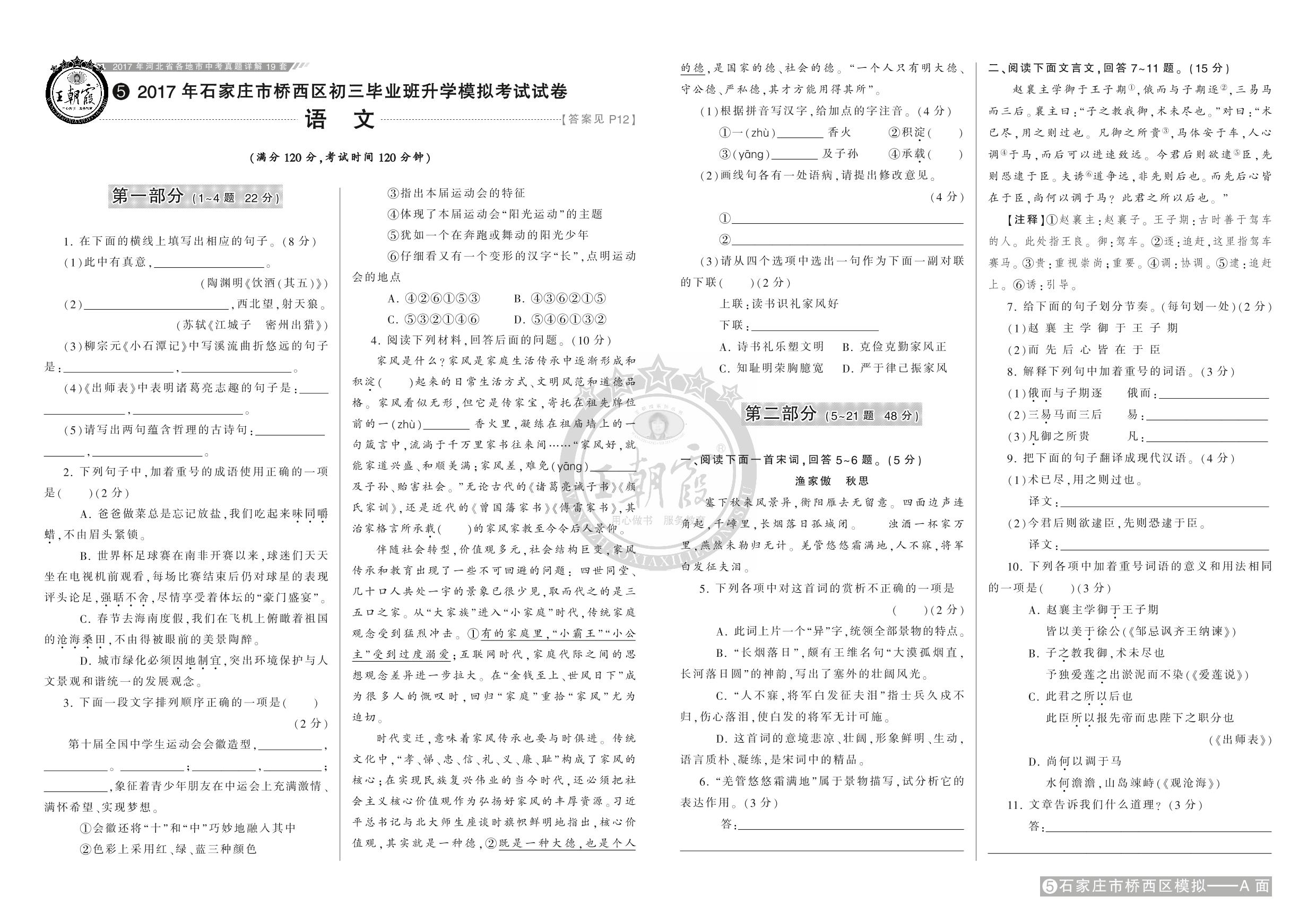 2017年石家庄市桥西区初三毕业班升学模拟考试试卷【5】