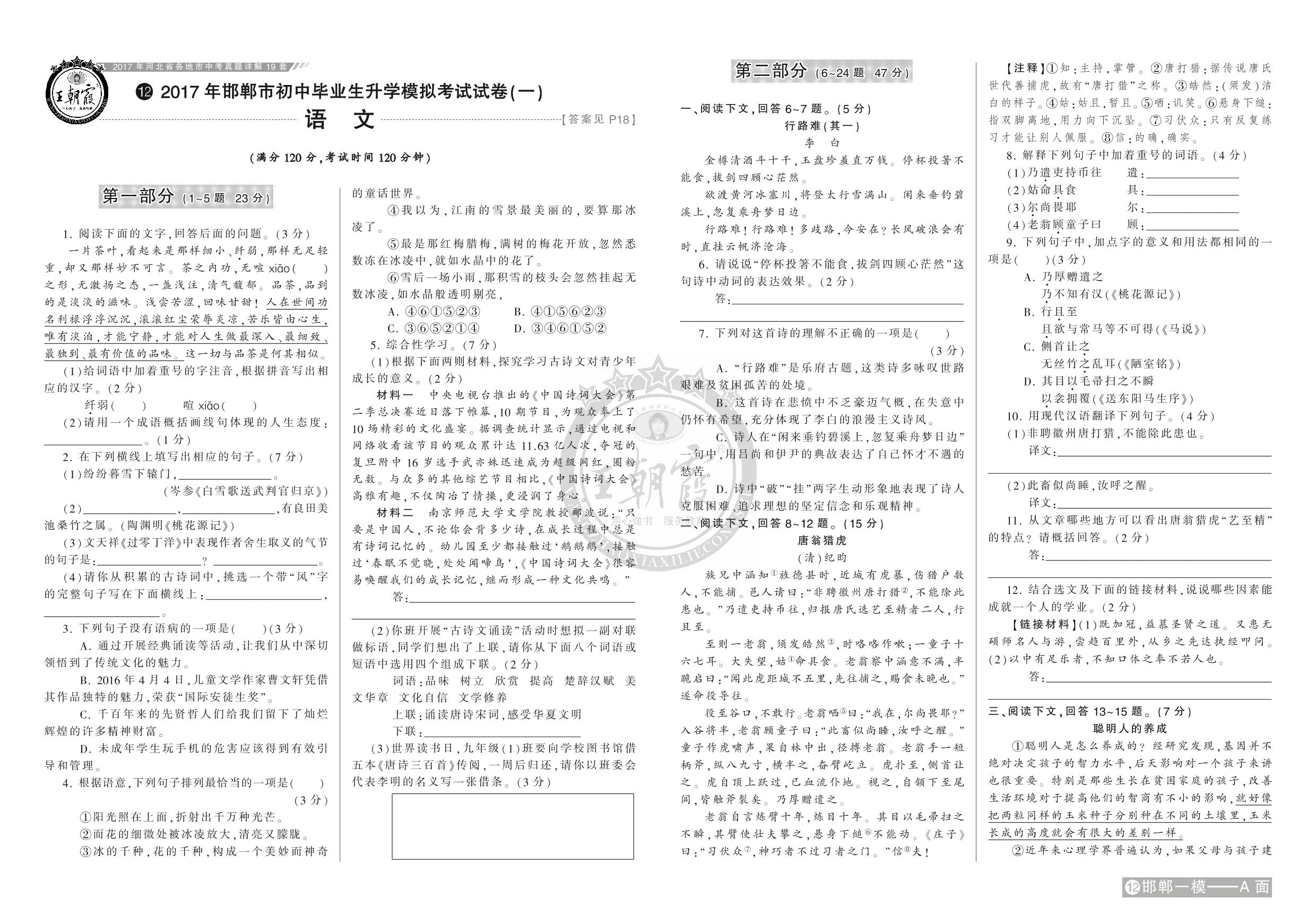 2017年邯郸市初中毕业生升学模拟考试试卷(一)【12】