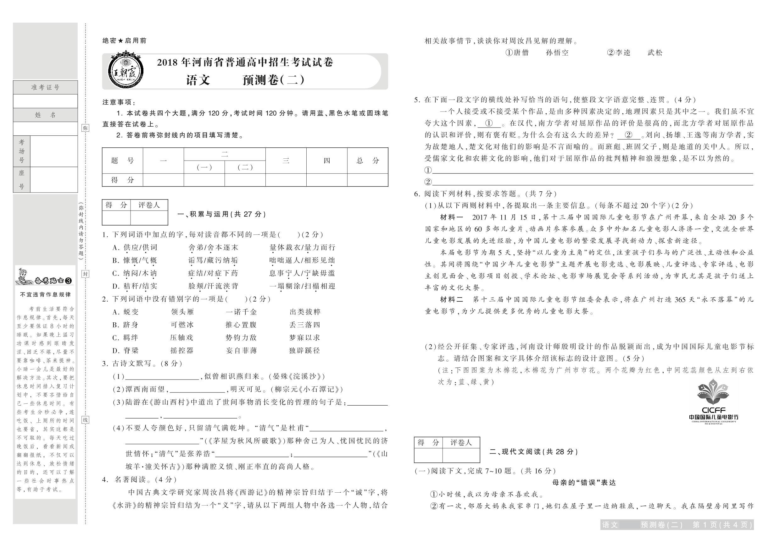2018年河南省普通高中招生考试试卷语文·预测卷(二)