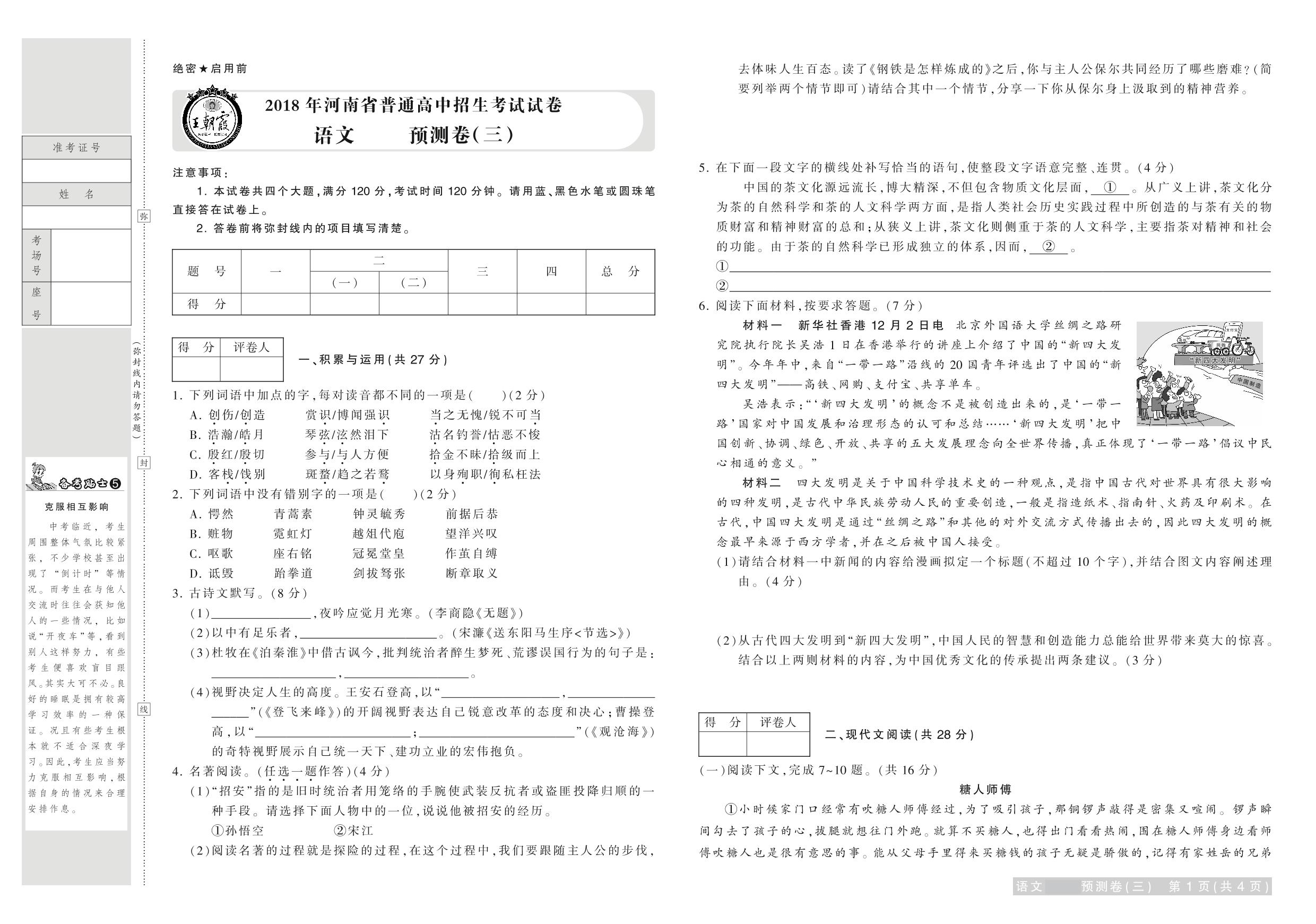 2018年河南省普通高中招生考试试卷语文·预测卷(三)