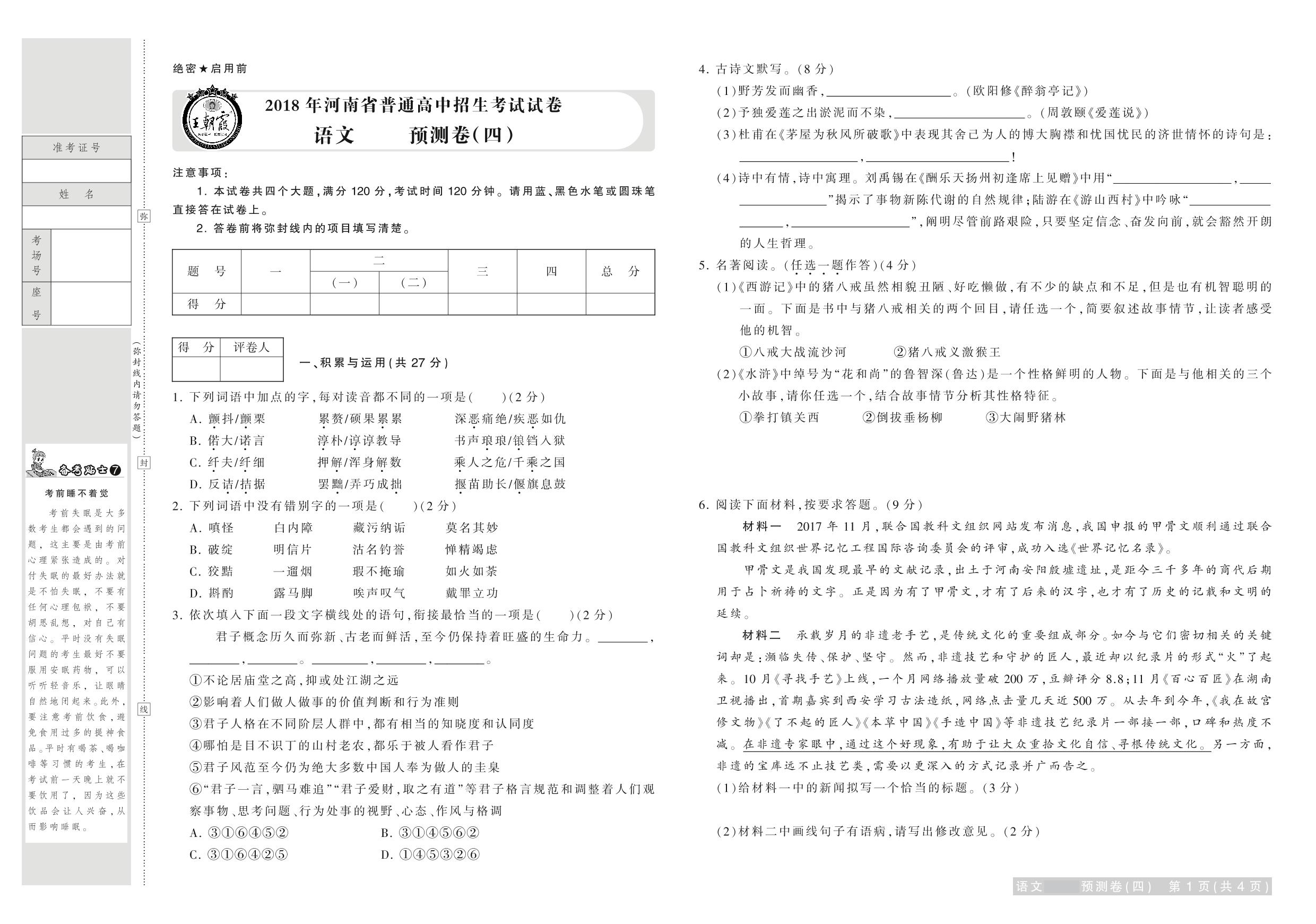 2018年河南省普通高中招生考试试卷语文·预测卷(四)