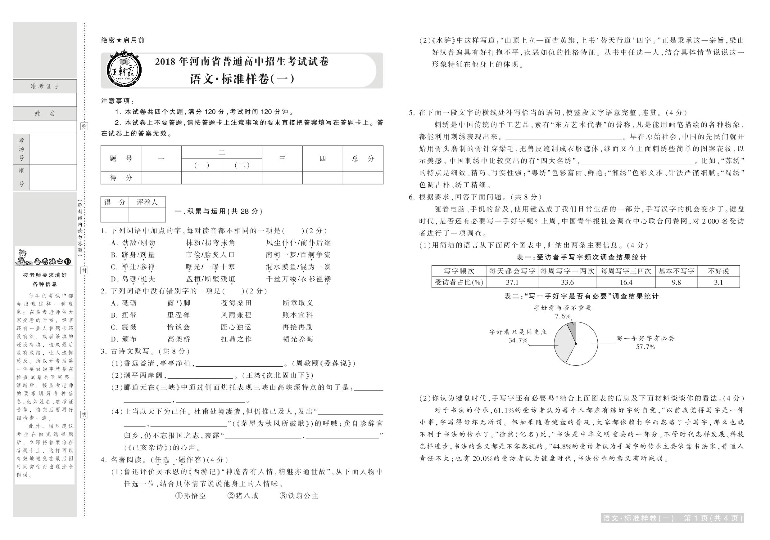 2018年河南省普通高中招生考试试卷语文·标准样卷(一)
