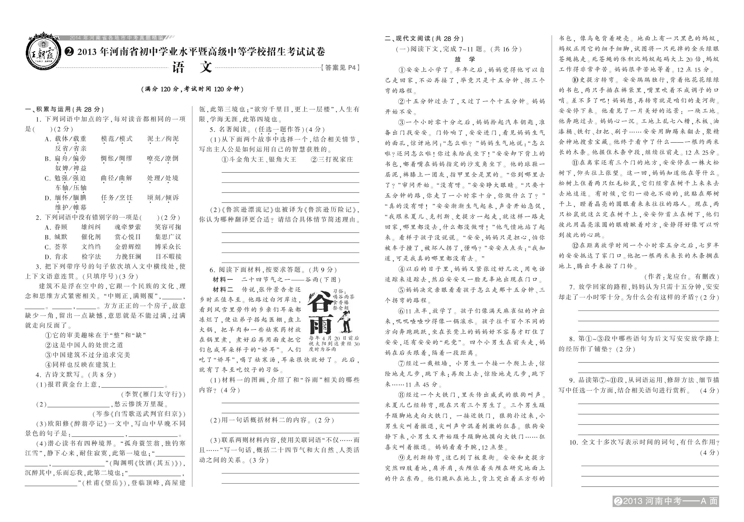 2013年河南省初中学业水平暨高级中等学校招生考试试卷【2】