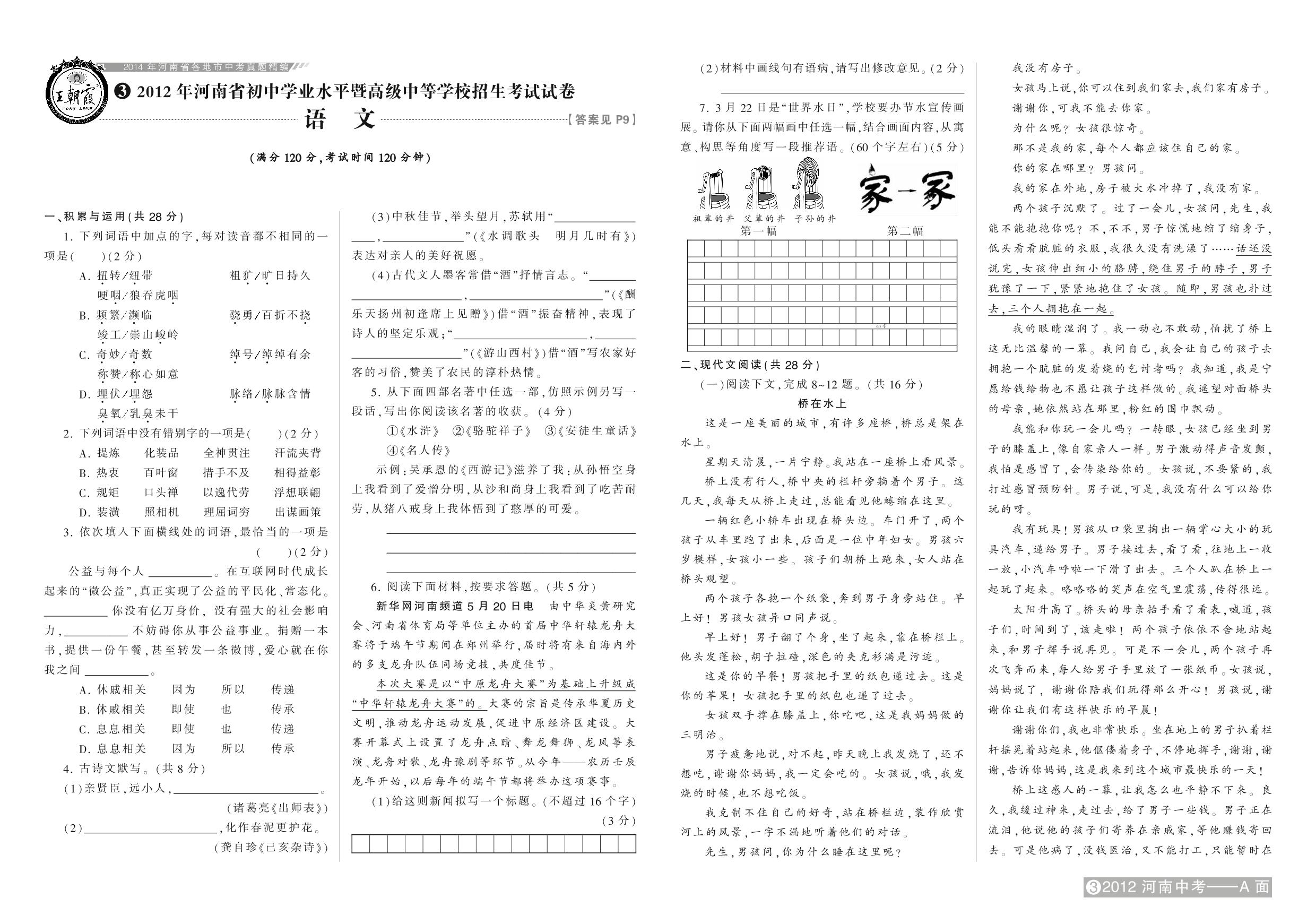 2012年河南省初中学业水平暨高级中等学校招生考试试卷【3】