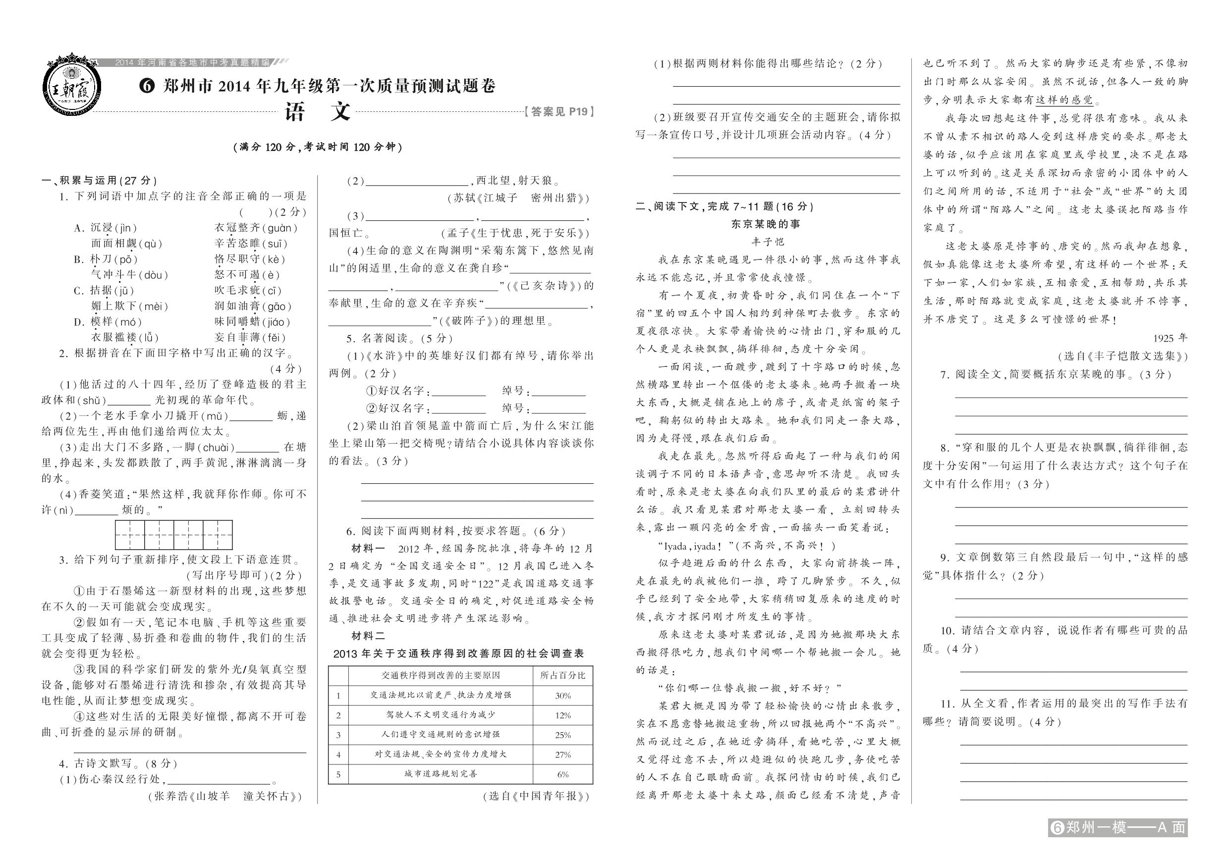 郑州市2014年九年级第一次质量预测试题卷【6】