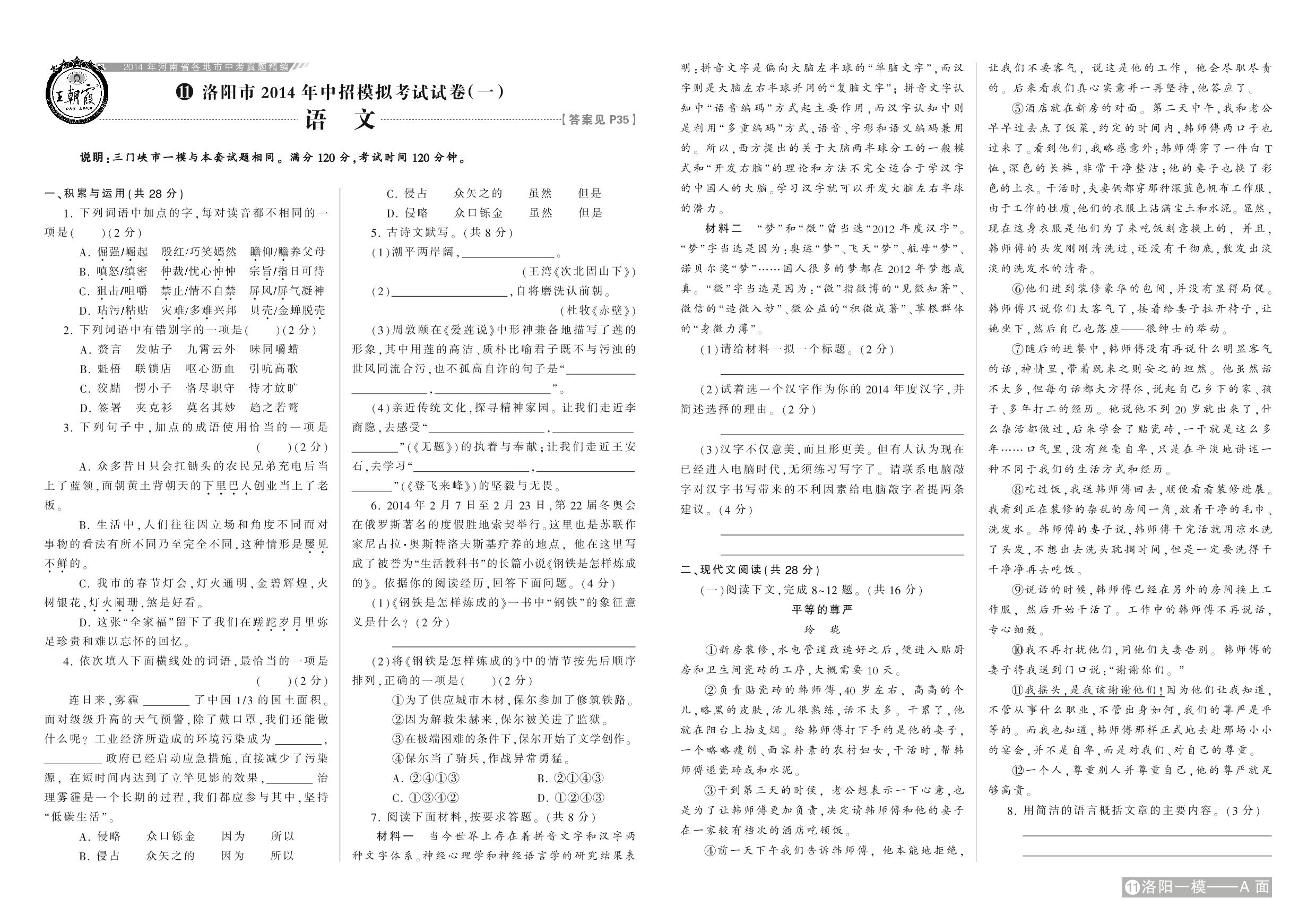 洛阳市2014年中招模拟考试试卷(一)【11】