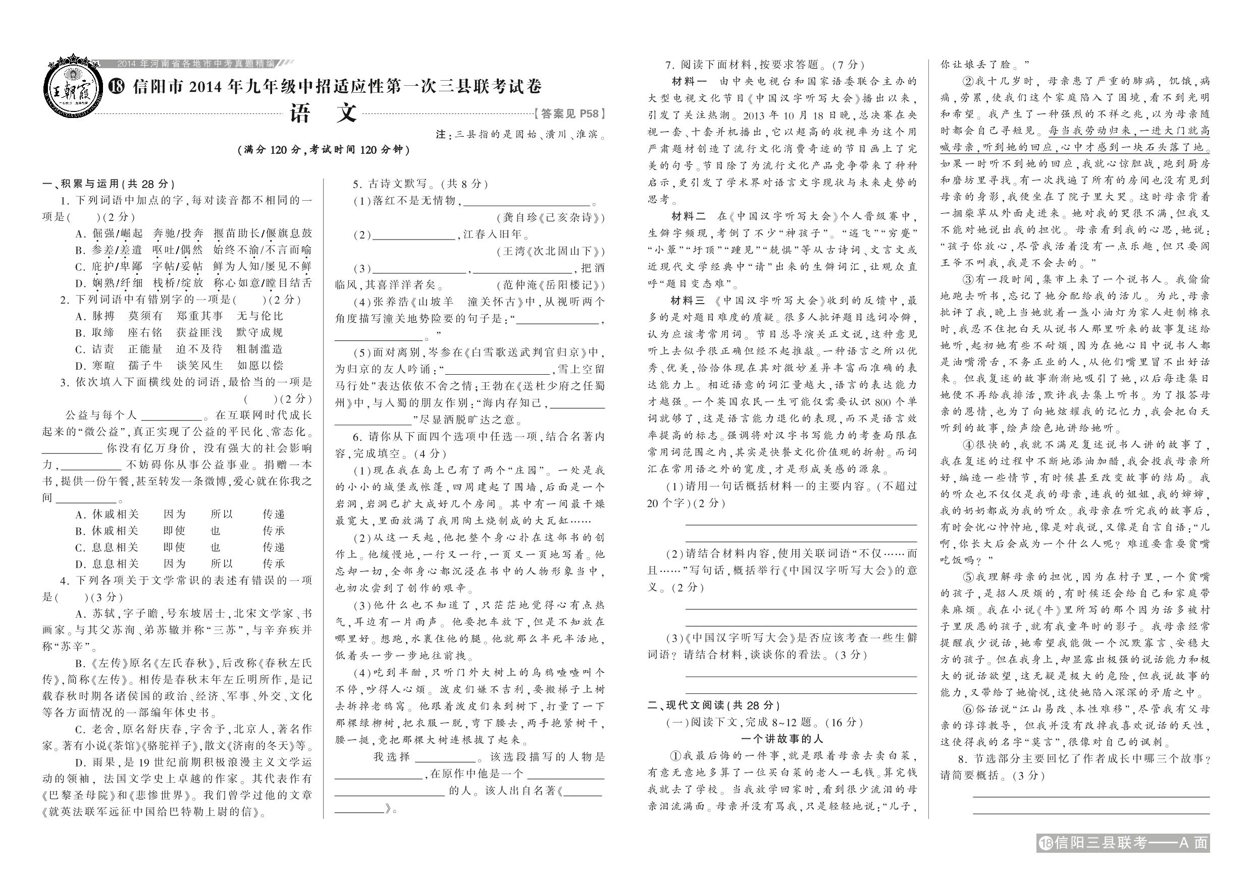 信阳市2014年九年级中招适应性第一次三县联考试卷【18】