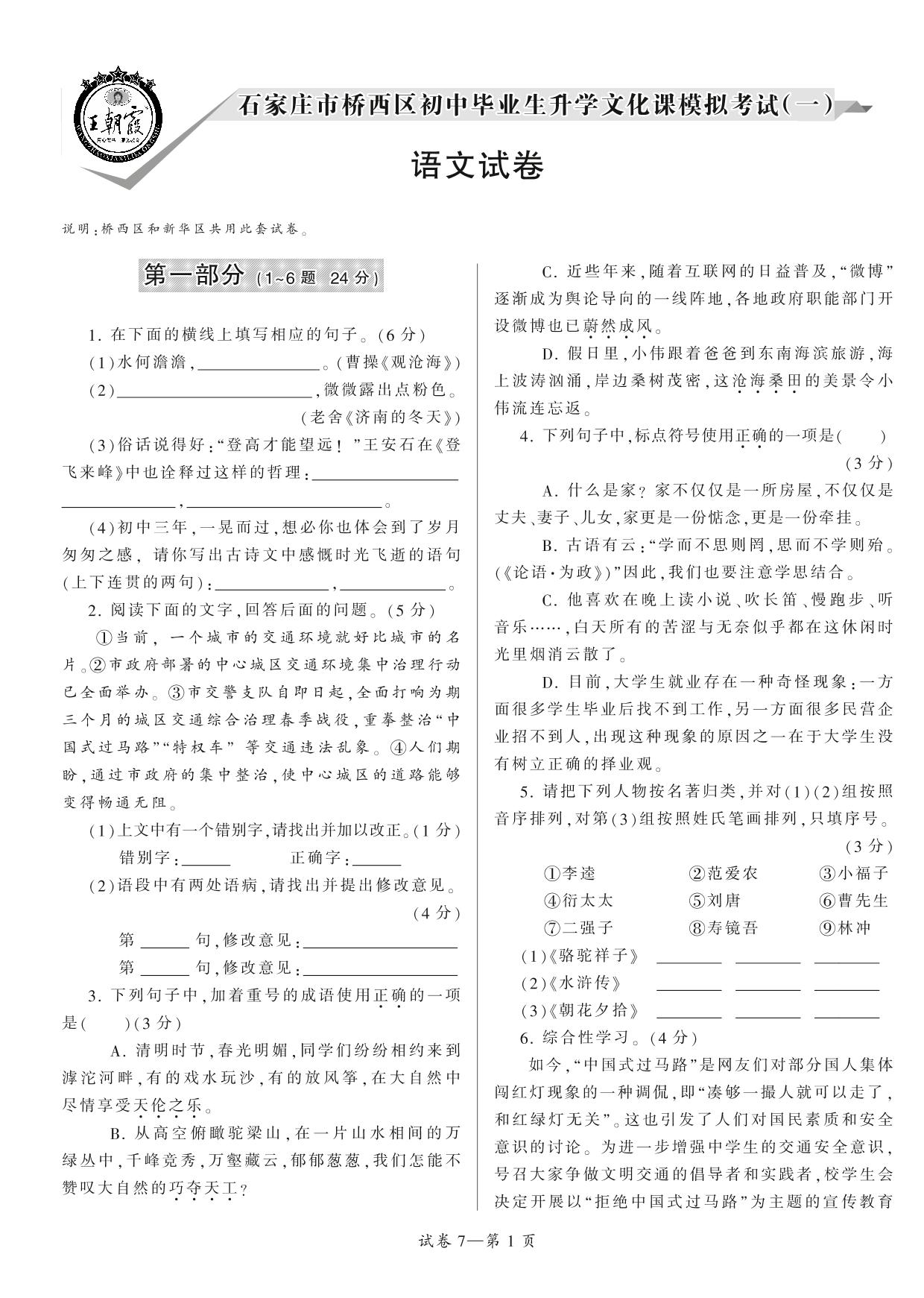 石家庄市桥西区初中毕业生升学文化课模拟考试(一)【7】