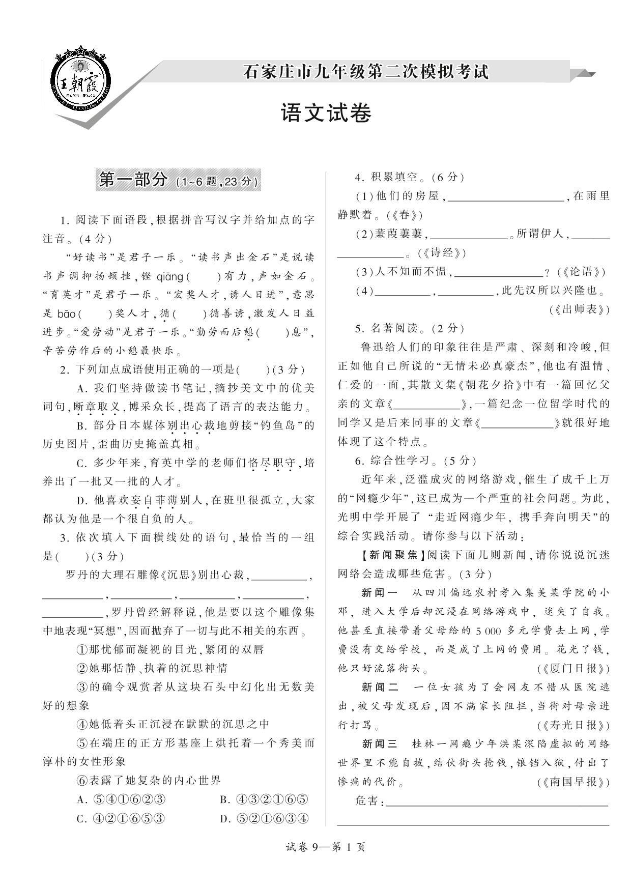 石家庄市九年级第二次模拟考试【9】
