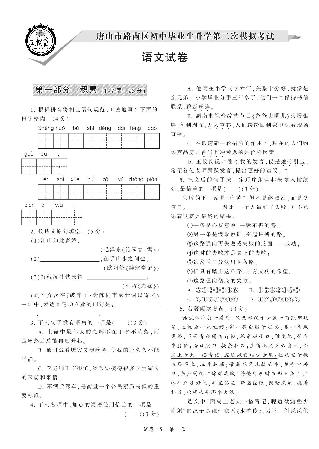 唐山市路南区初中毕业生升学第二次模拟考试【15】
