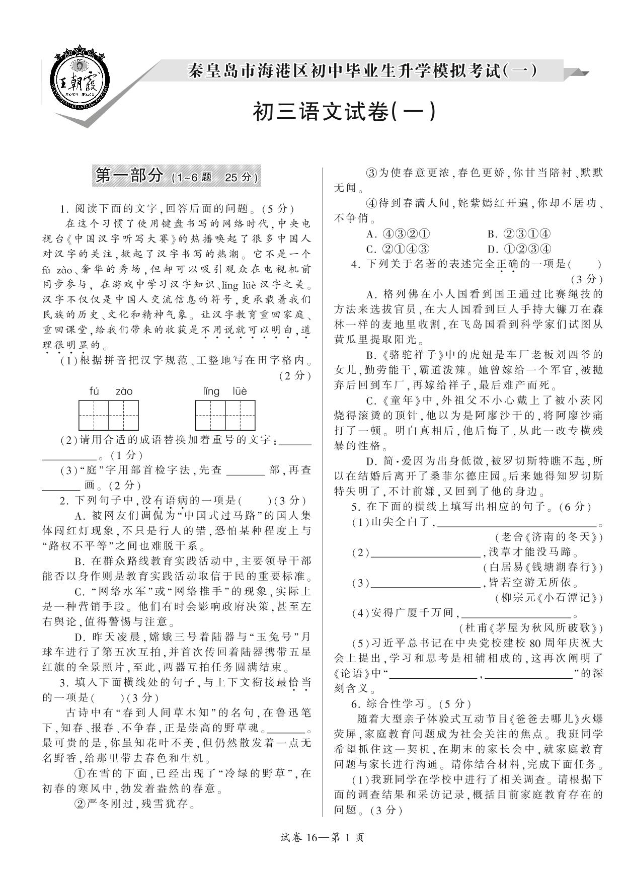 秦皇岛市海港区初中毕业生升学模拟考试(一)【16】