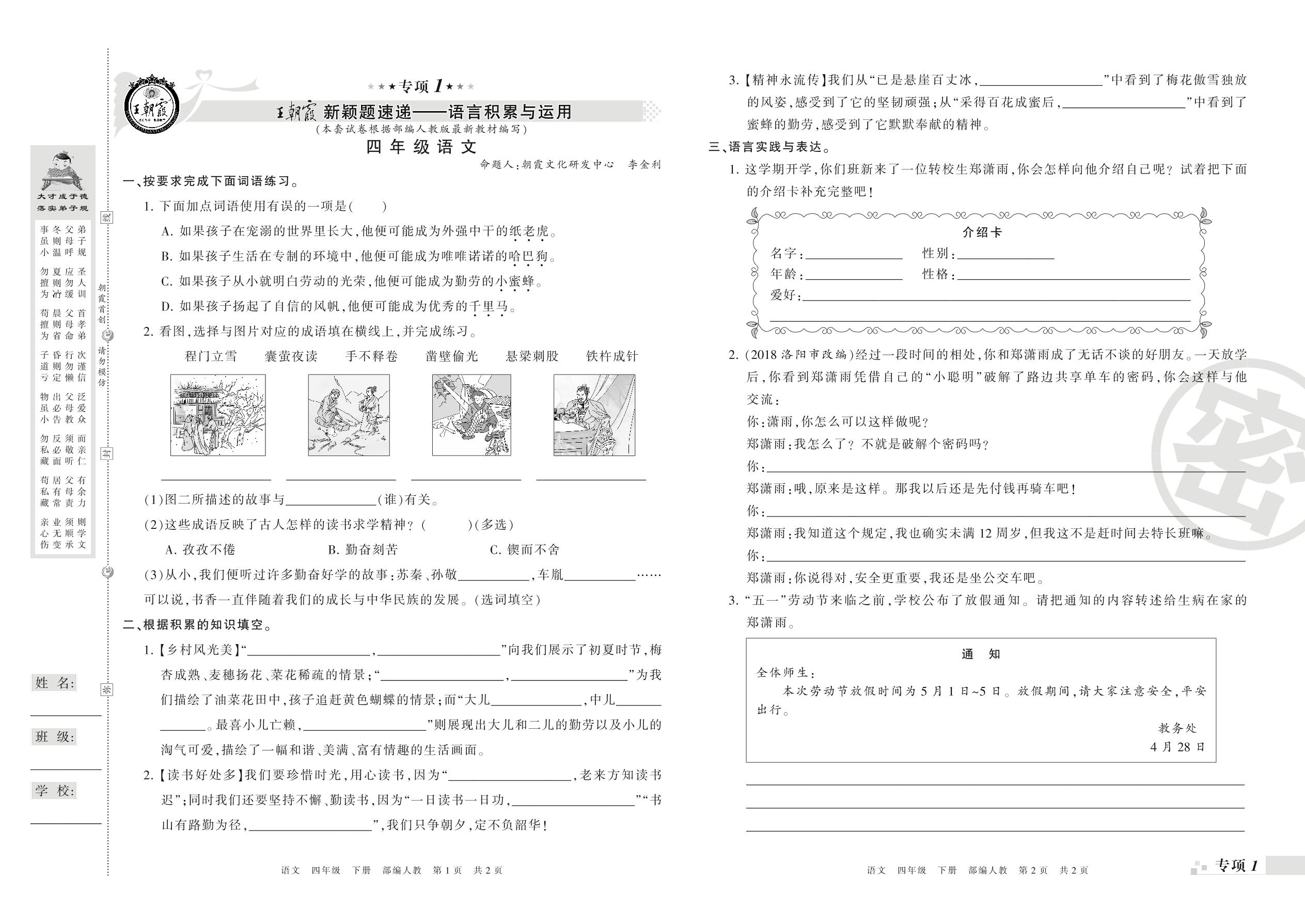 王朝霞期末专项卷——新颖题速递:语言积累与运用、非连续性文本阅读四年级下册语文(人教版)_R210801192954【0】