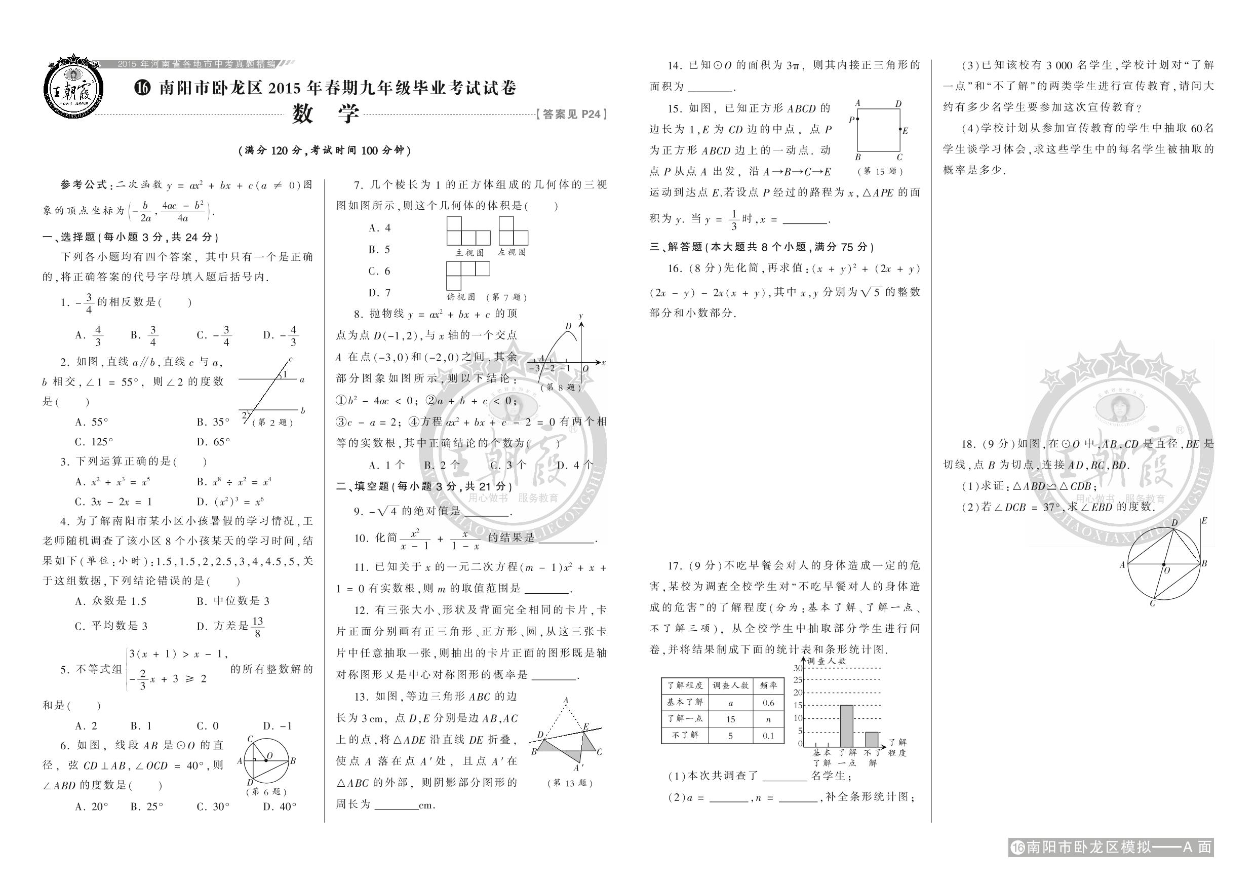 南阳市卧龙区2015年春期九年级毕业考试试卷【16】