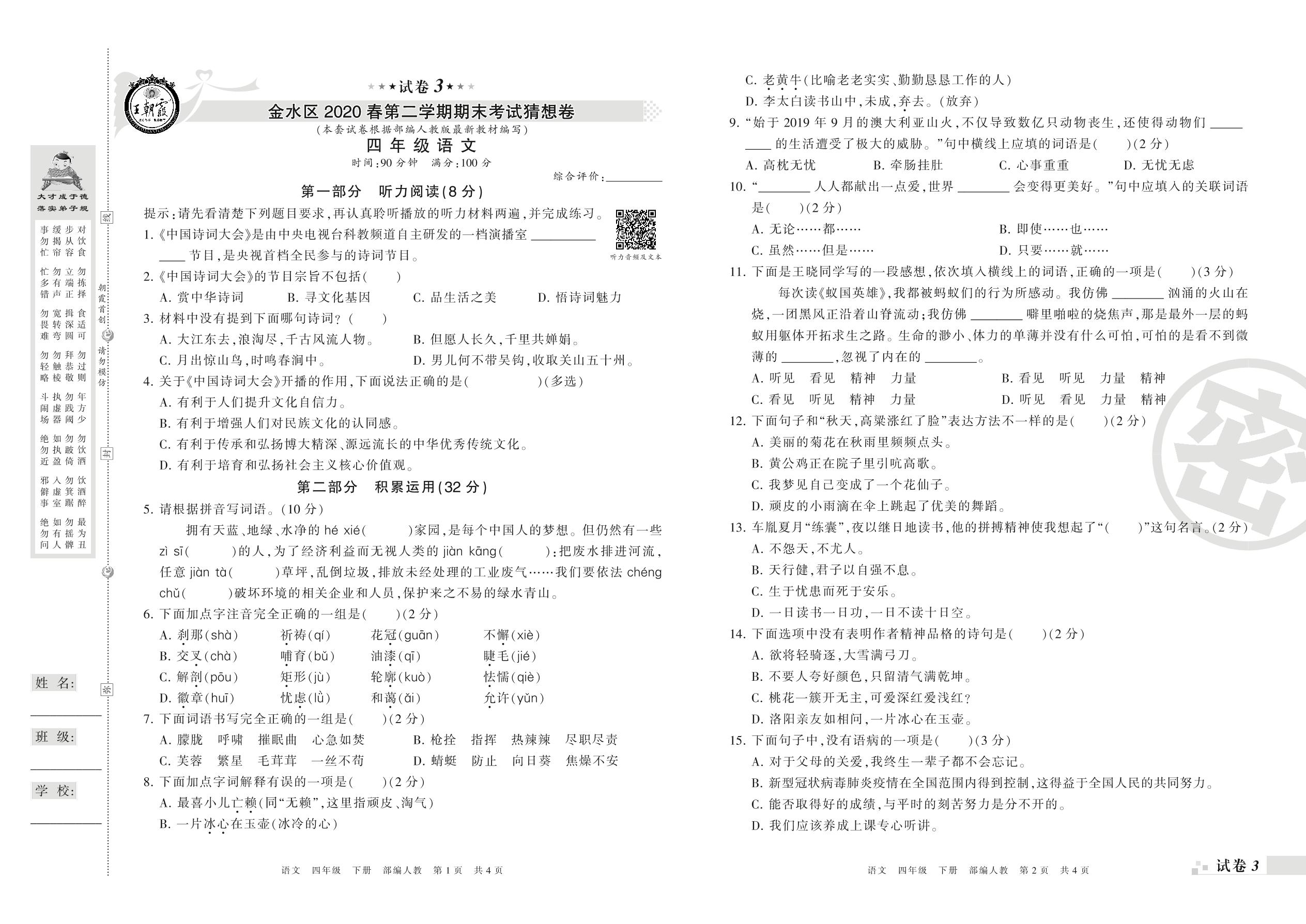 四年级语文人教版下册期末卷