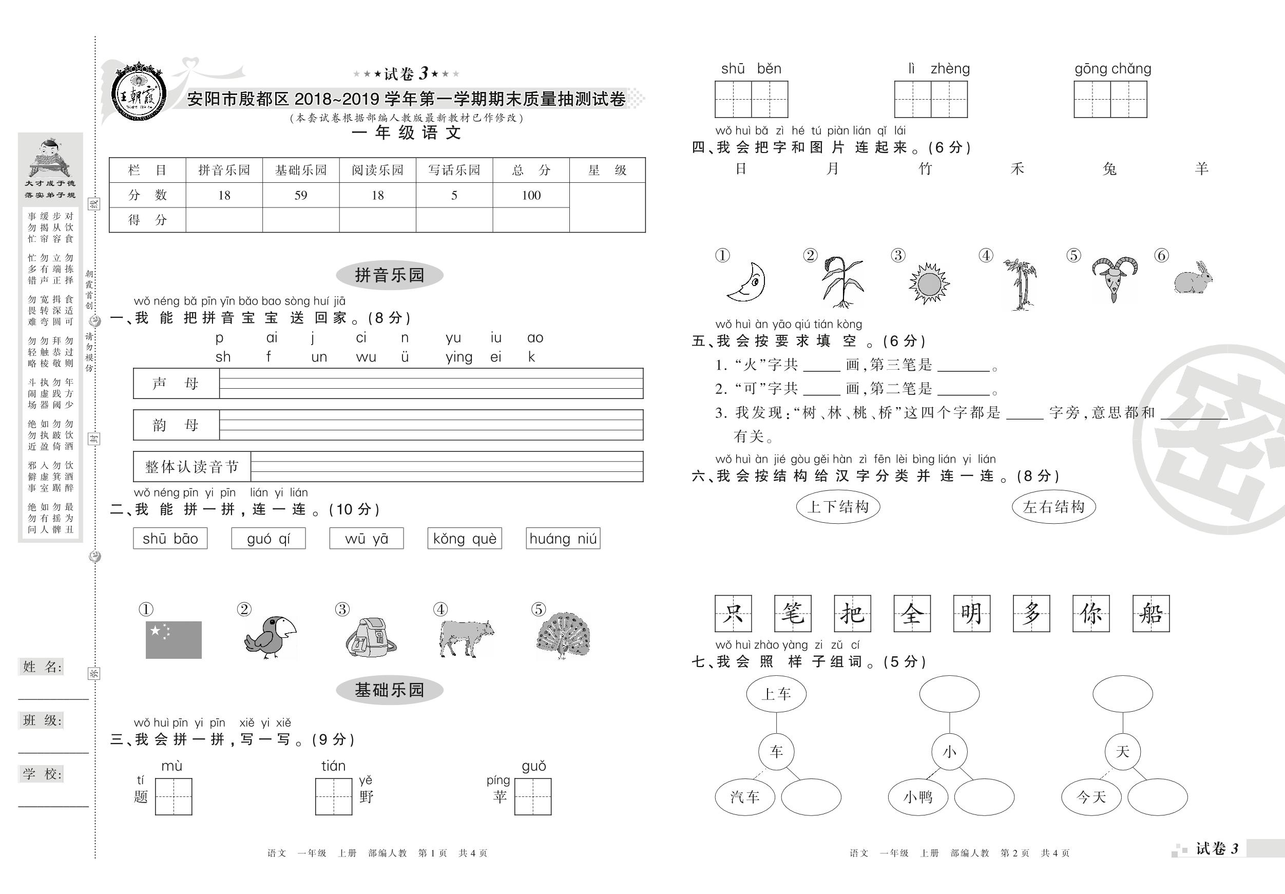 2018-2019学年第一学期安阳市殷都区一年级语文试卷(人教版)【3】