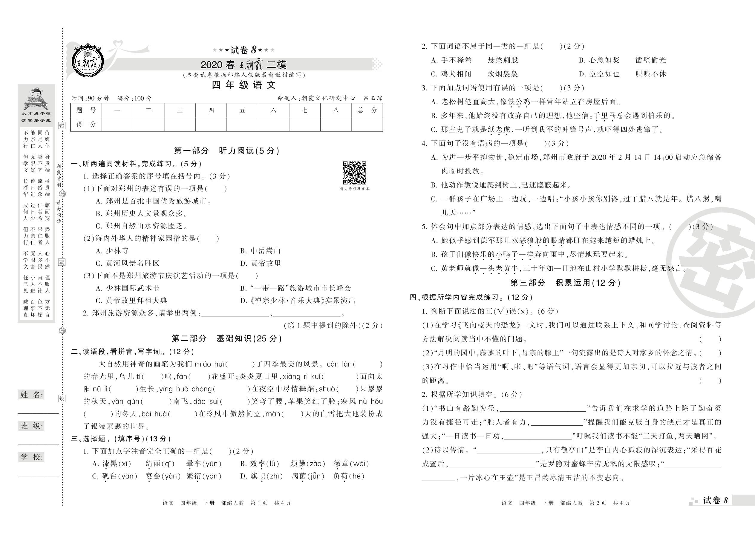 王朝霞期末模拟卷四年级下册语文(人教版)_R210801193037【8】