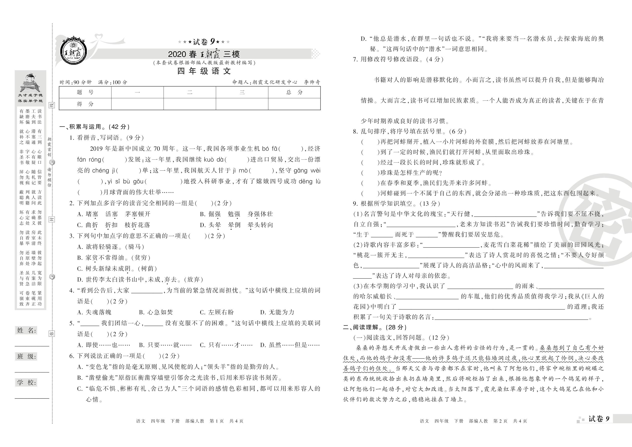 王朝霞期末模拟卷四年级下册语文(人教版)_R210801193042【9】