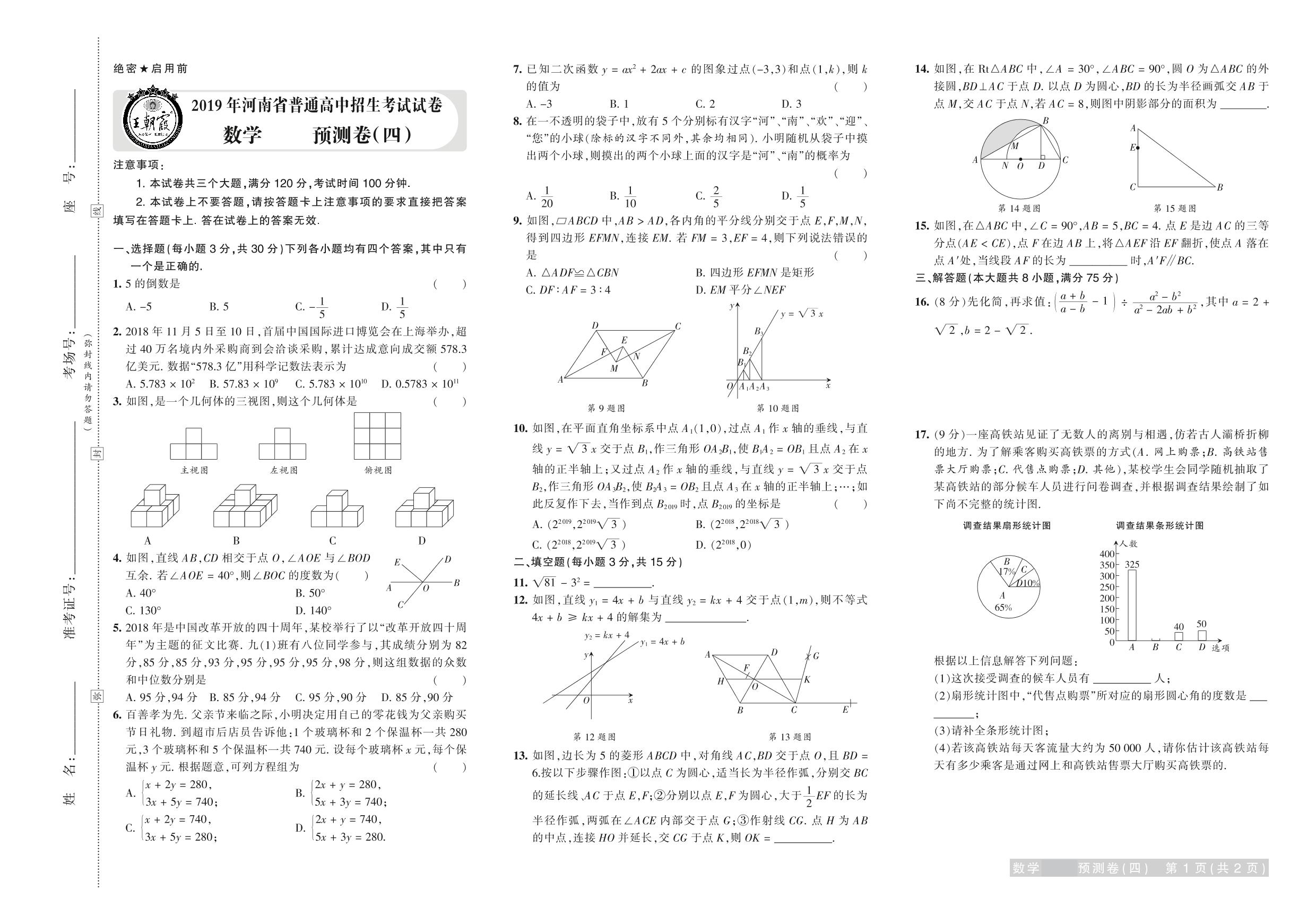 2019年河南省普通高中招生考试试卷数学·预测卷(四)
