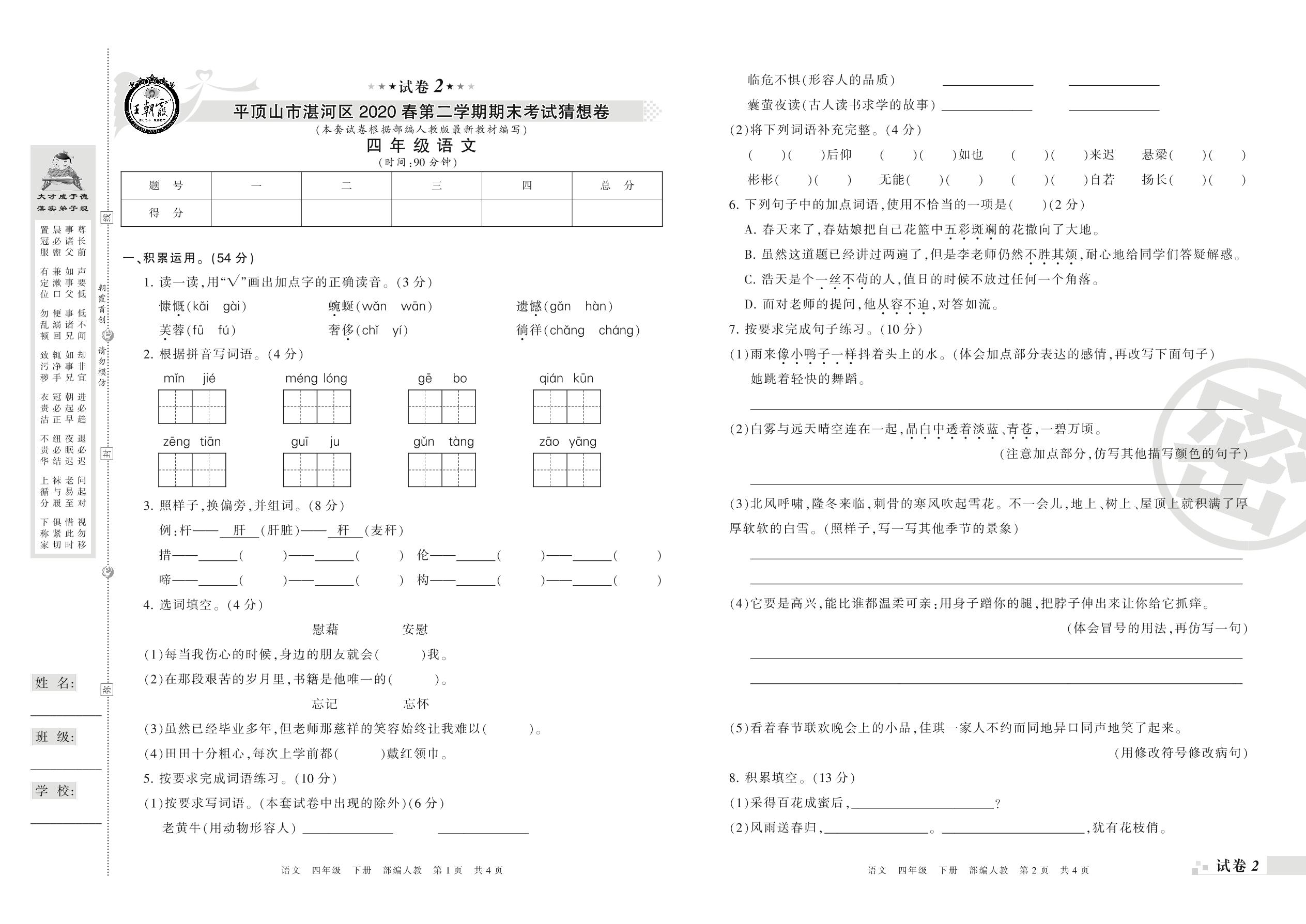 2018-2019学年第二学期平顶山市湛河区猜想卷四年级语文试卷(人教版)【2】