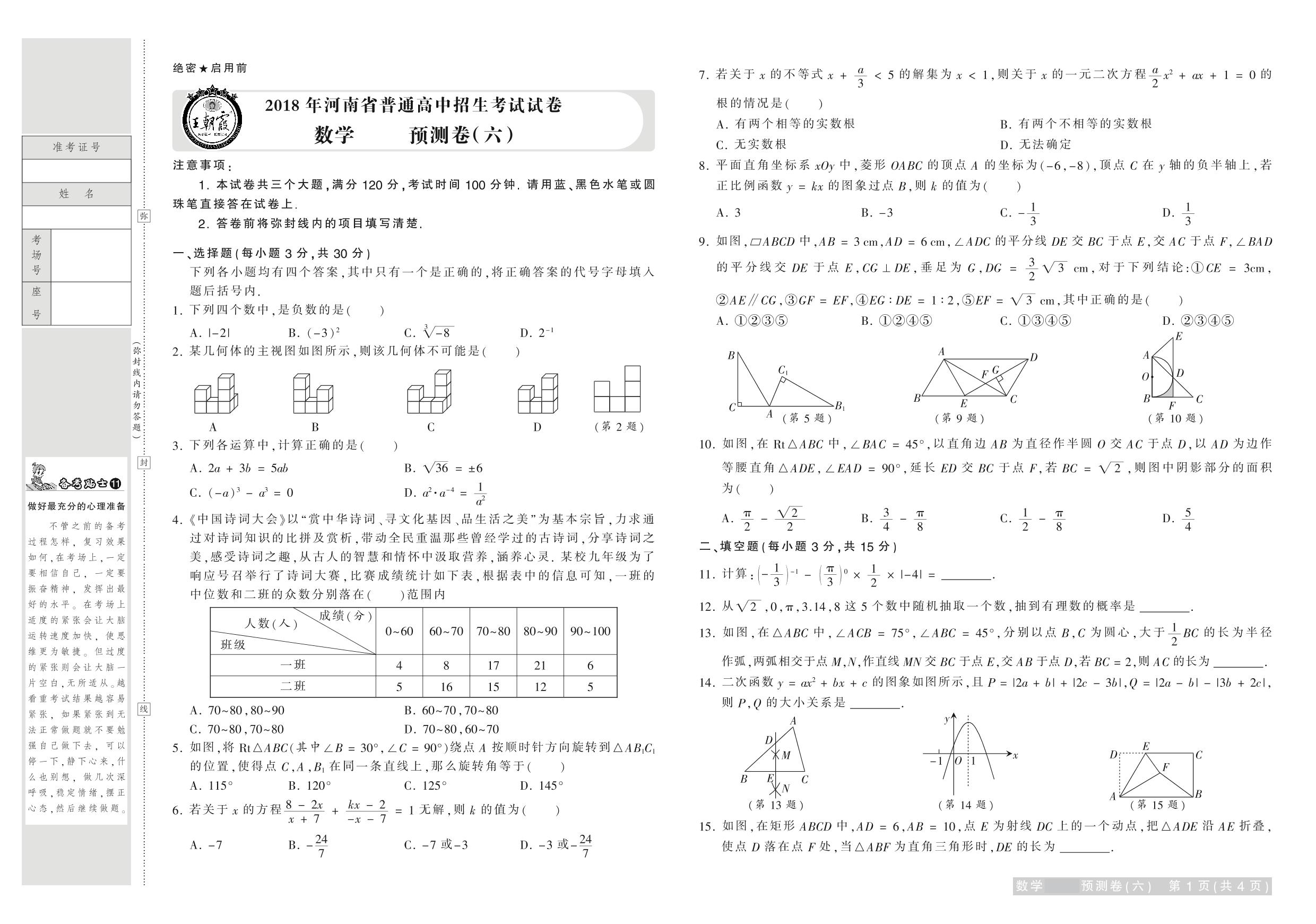 2018年河南省普通高中招生考试试卷数学·预测卷(六)