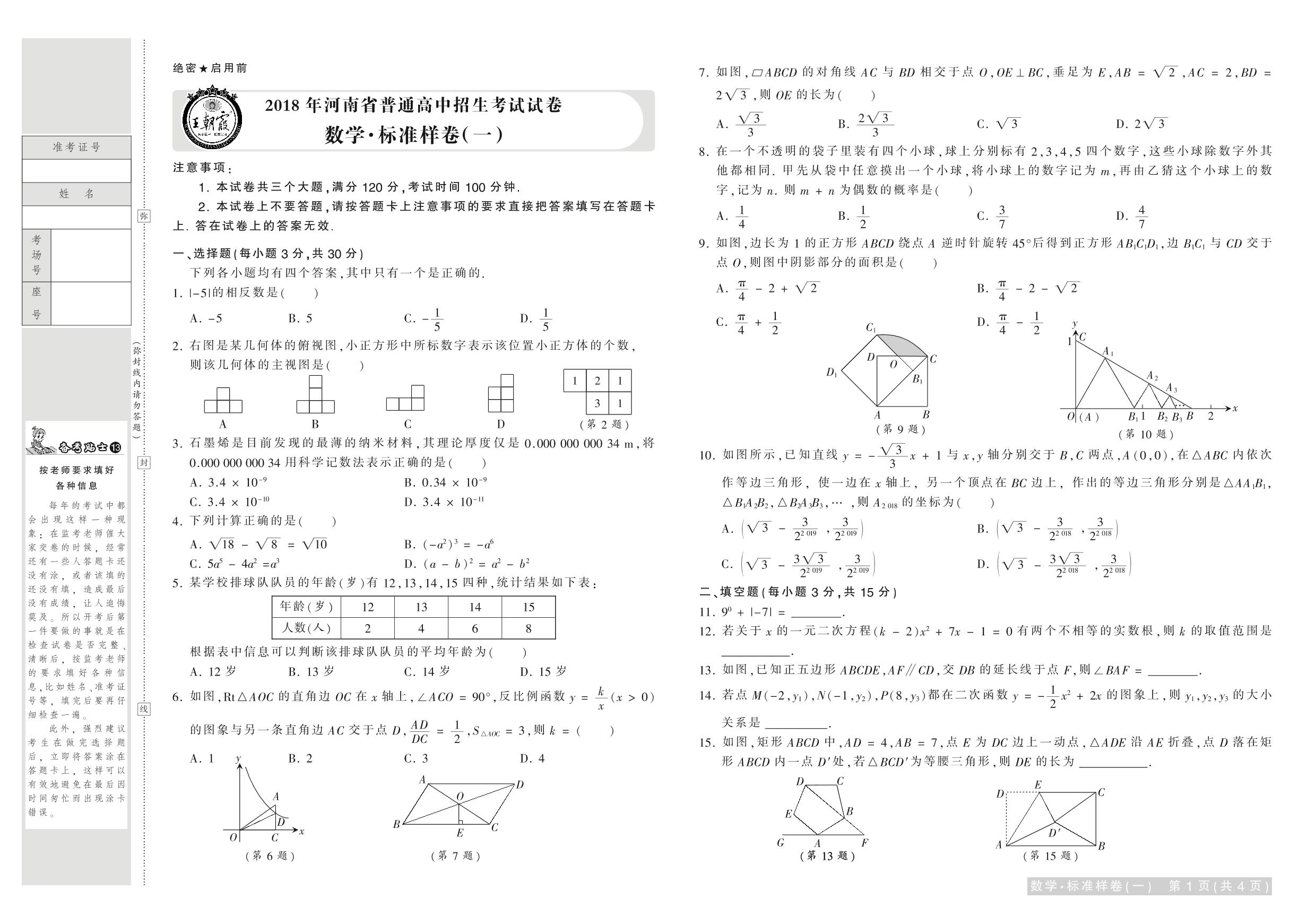 2018年河南省普通高中招生考试试卷数学·标准样卷(一)