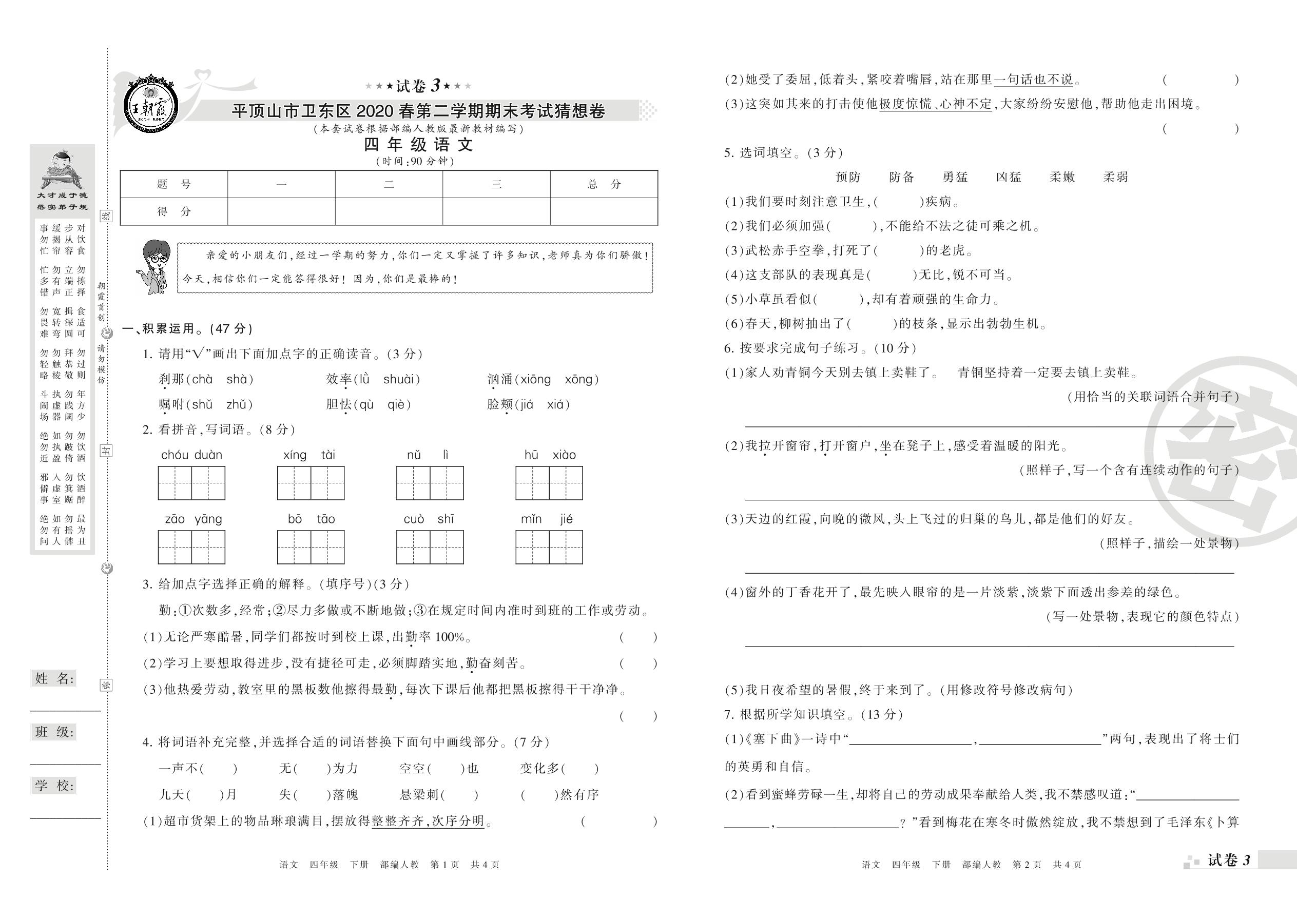 2018-2019学年第二学期平顶山市卫东区猜想卷四年级语文试卷(人教版)【3】