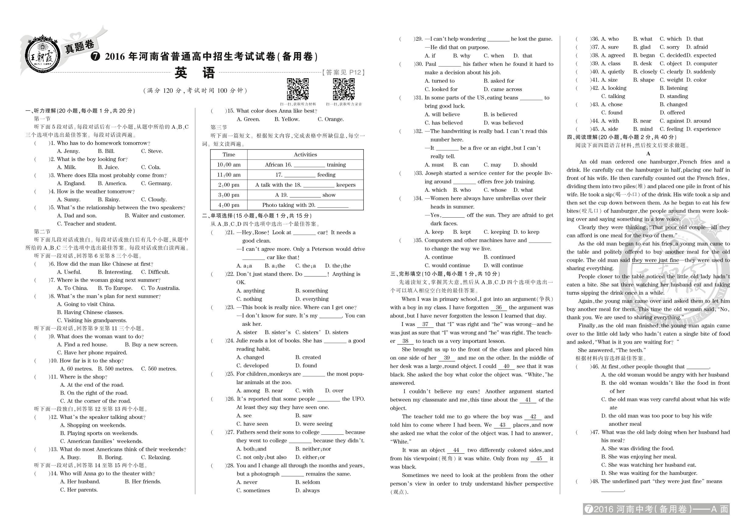 2016年河南省普通高中招生考试试卷(备用卷)【7】