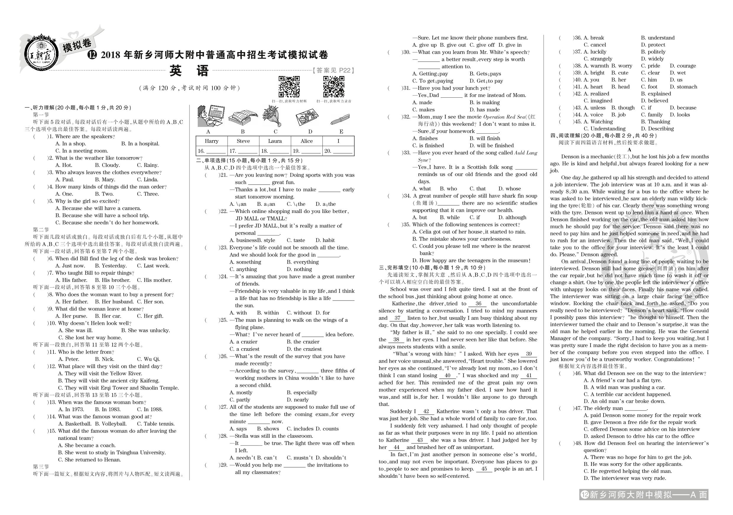 2018年新乡河师大附中普通高中招生考试模拟试卷【12】