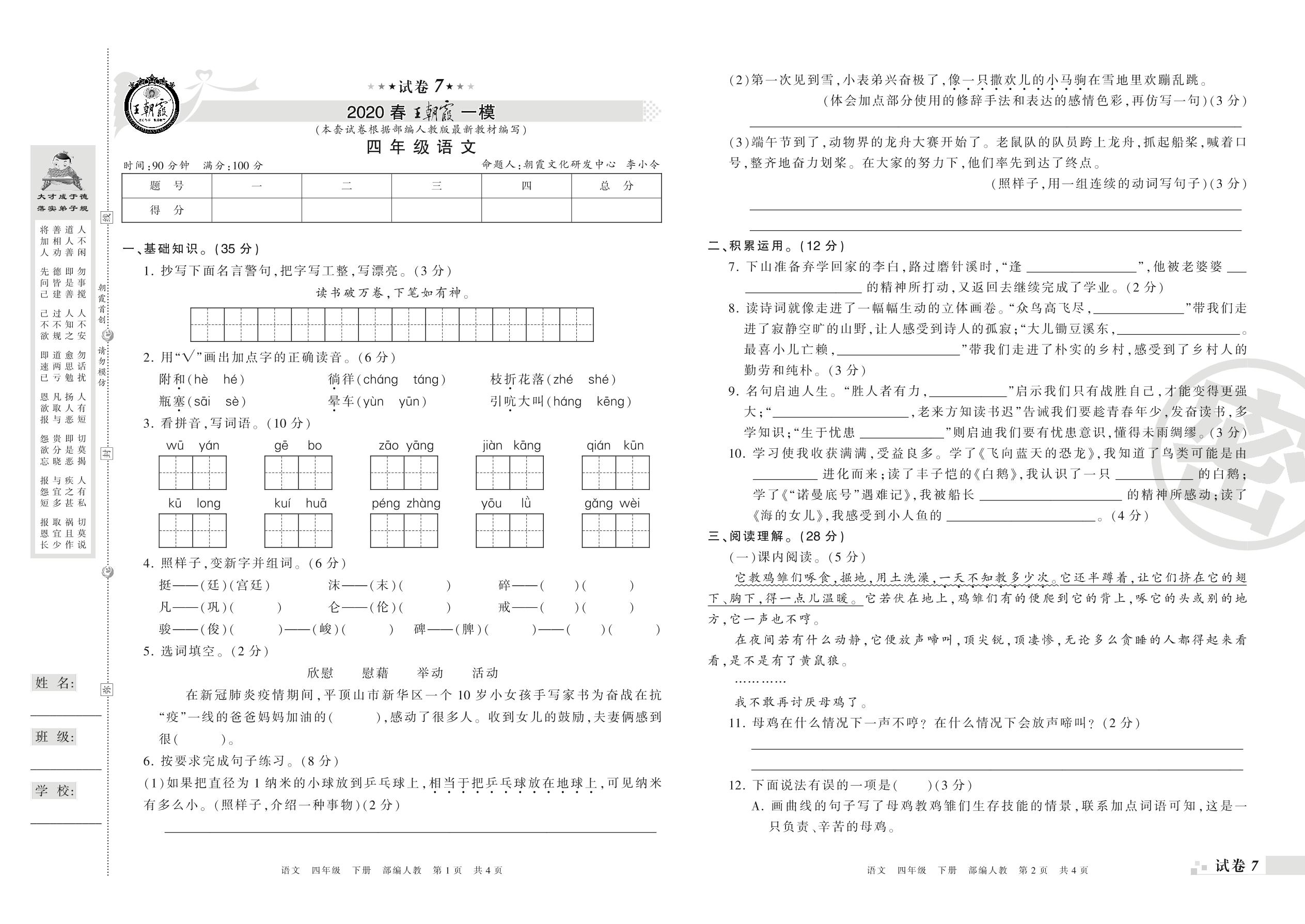 王朝霞期末模拟卷四年级下册语文(人教版)_R210801193129【7】