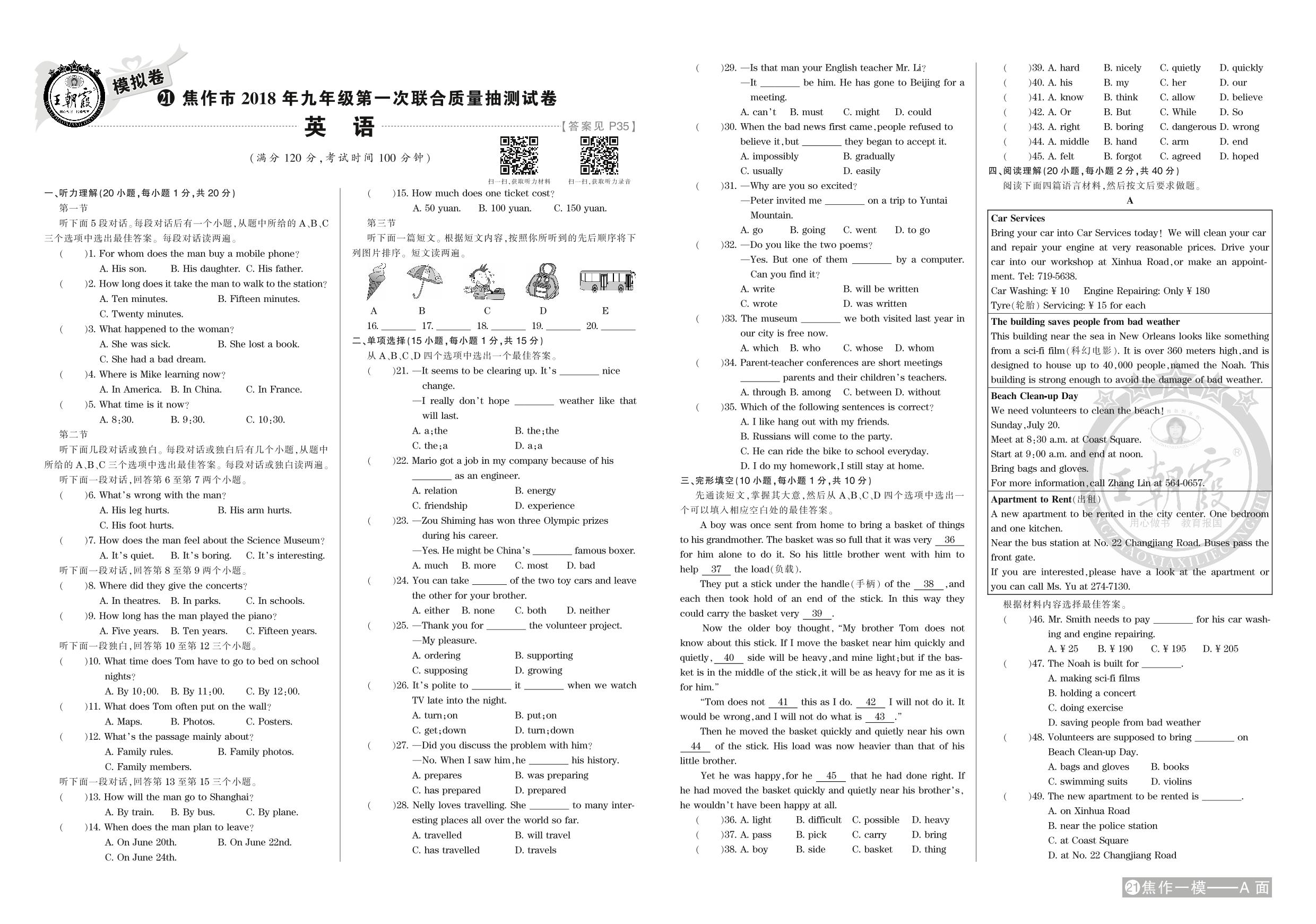 焦作市2018年九年级第一次联合质量抽测试卷【21】