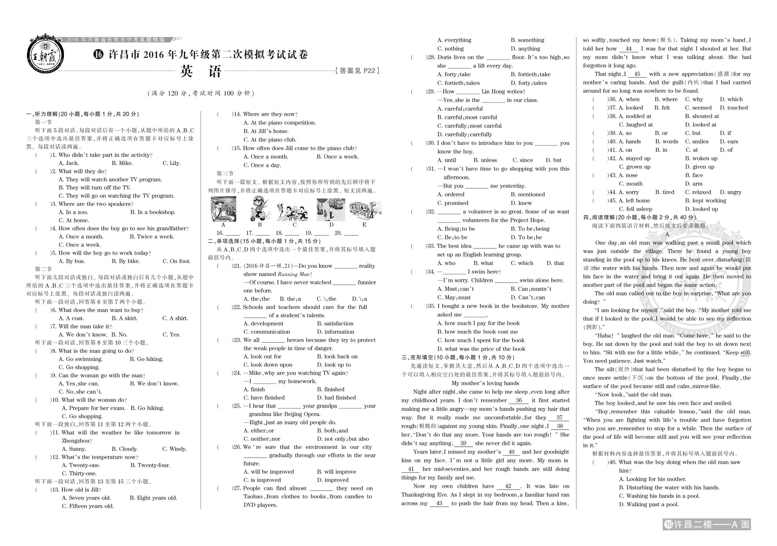 许昌市2016年九年级第二次模拟考试试卷【16】