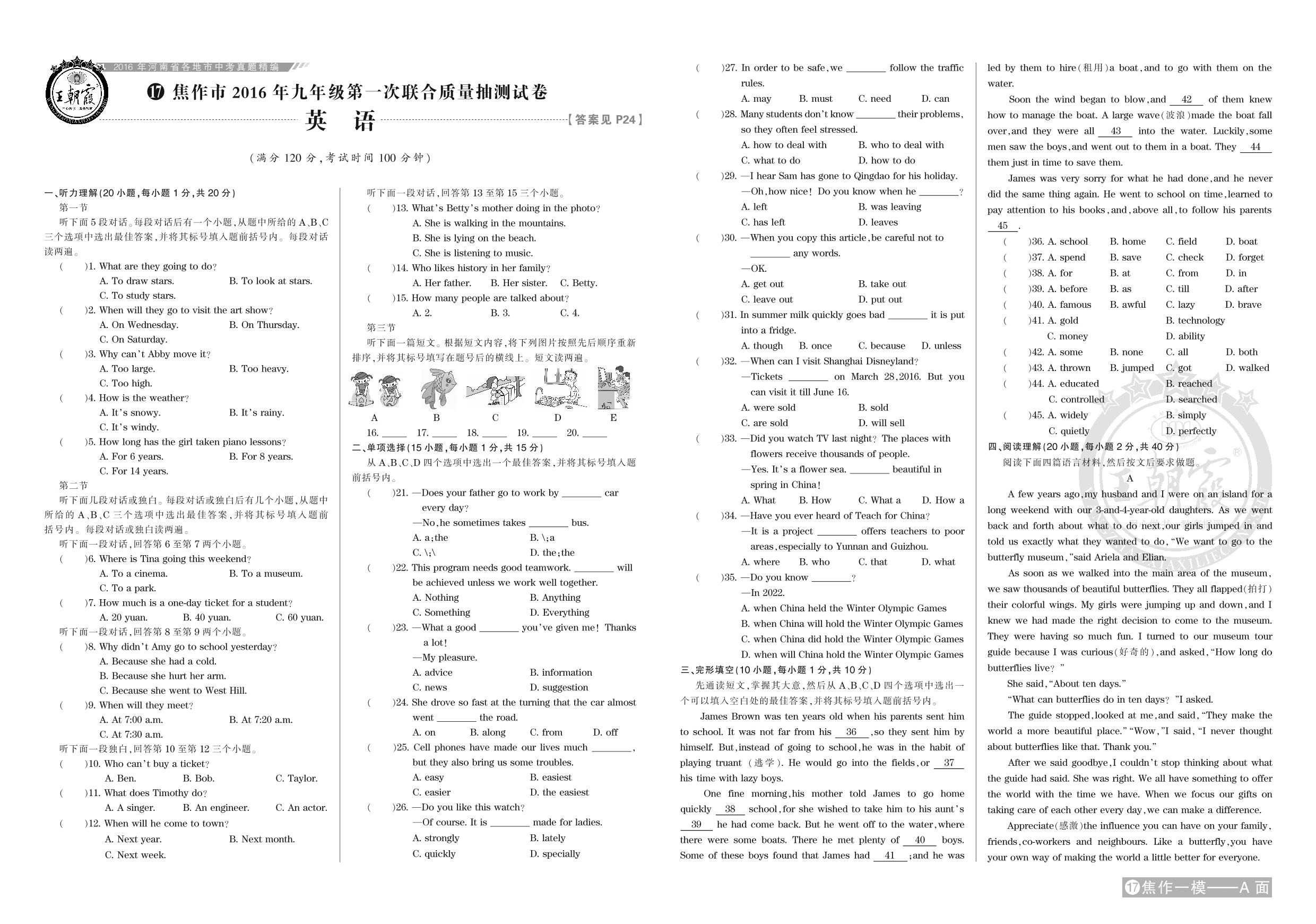 焦作市2016年九年级第一次联合质量抽测试卷【17】