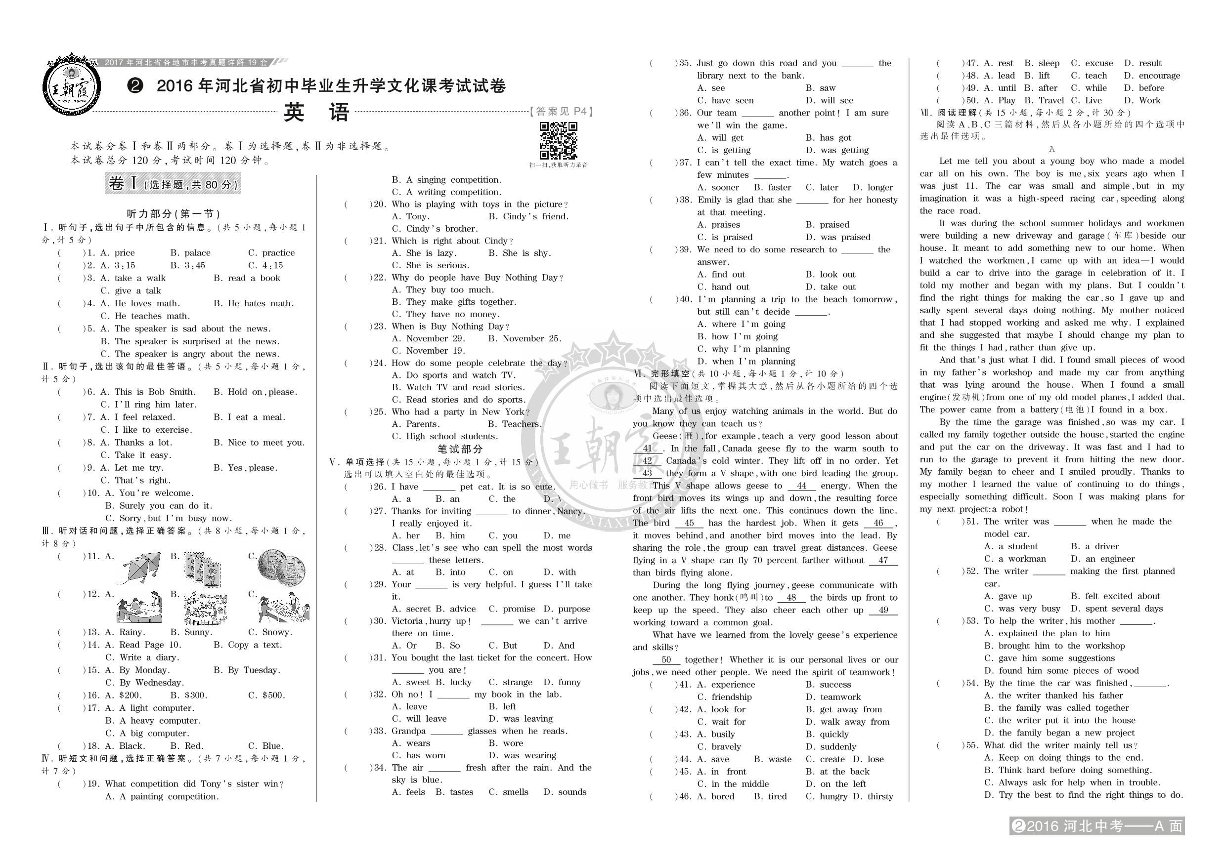 2016年河北省初中毕业升学文化课考试试卷【2】
