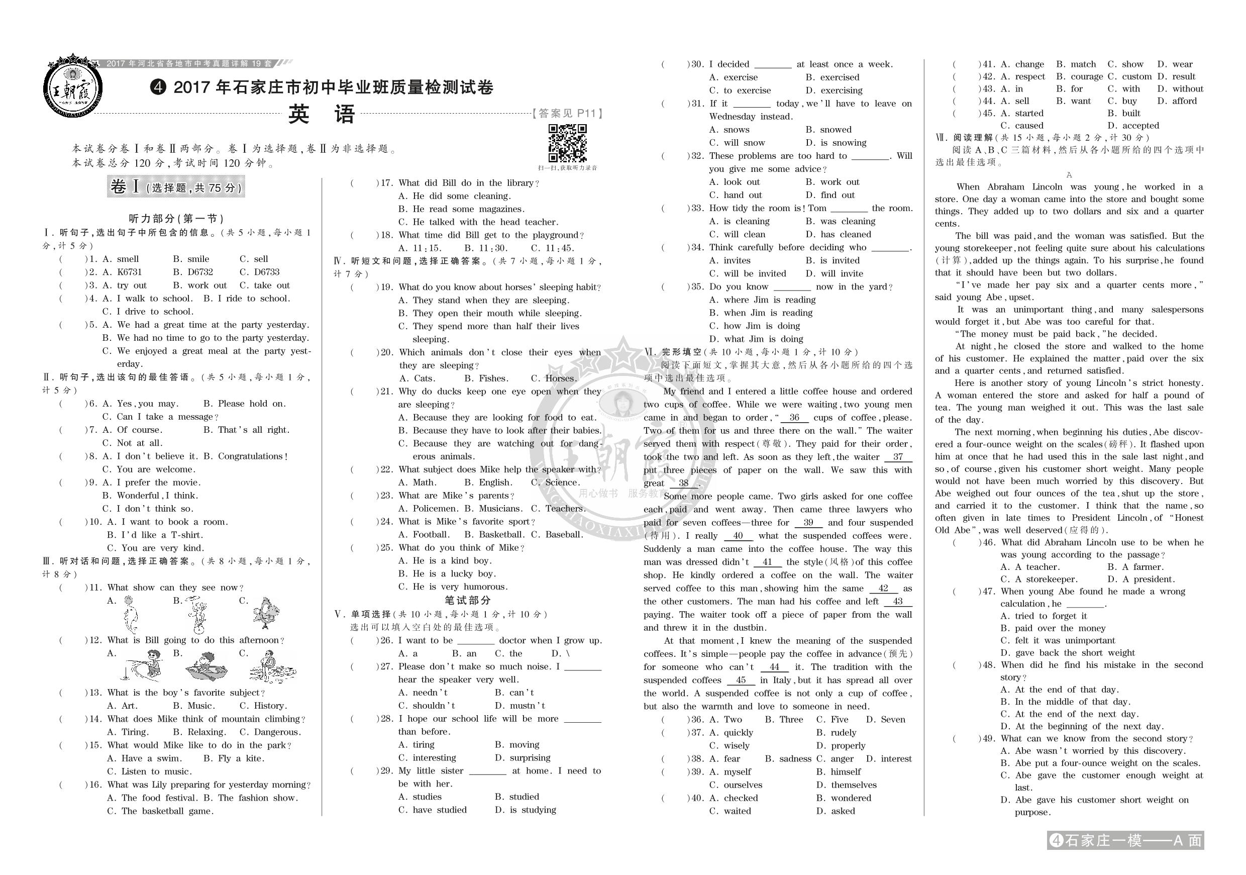 2017年石家庄市初中毕业班质量检测试卷【4】