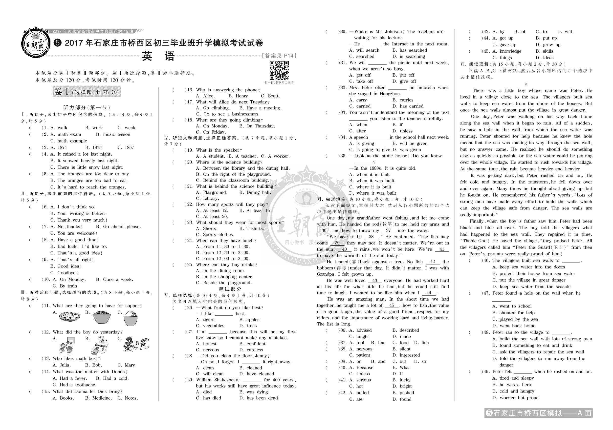 2017年石家庄市桥西区初三毕业班升学模拟考试试卷【5】