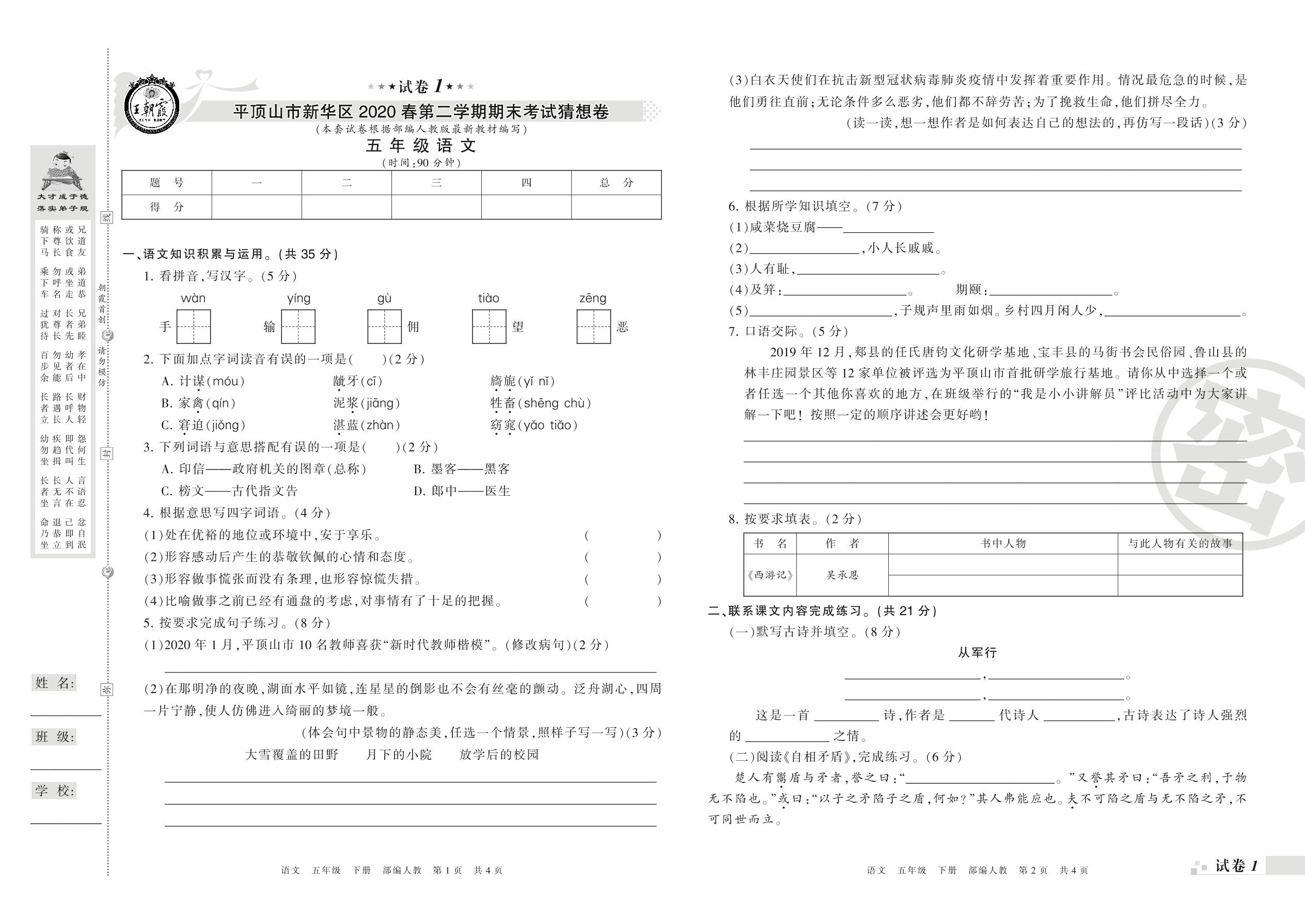 五年级语文人教版下册期末卷