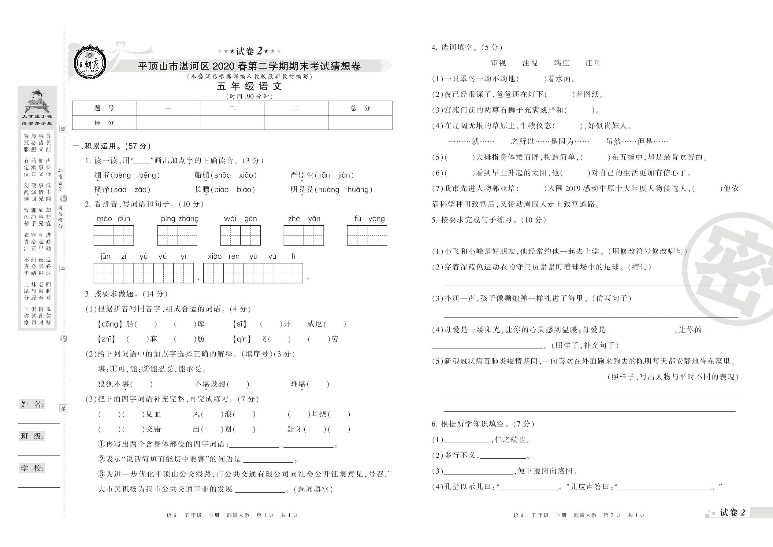 2018-2019学年第二学期平顶山市湛河区猜想卷五年级语文试卷(人教版)【2】